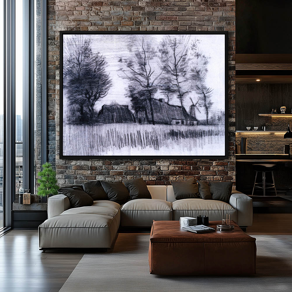 Landscape Drawing with a Cottage