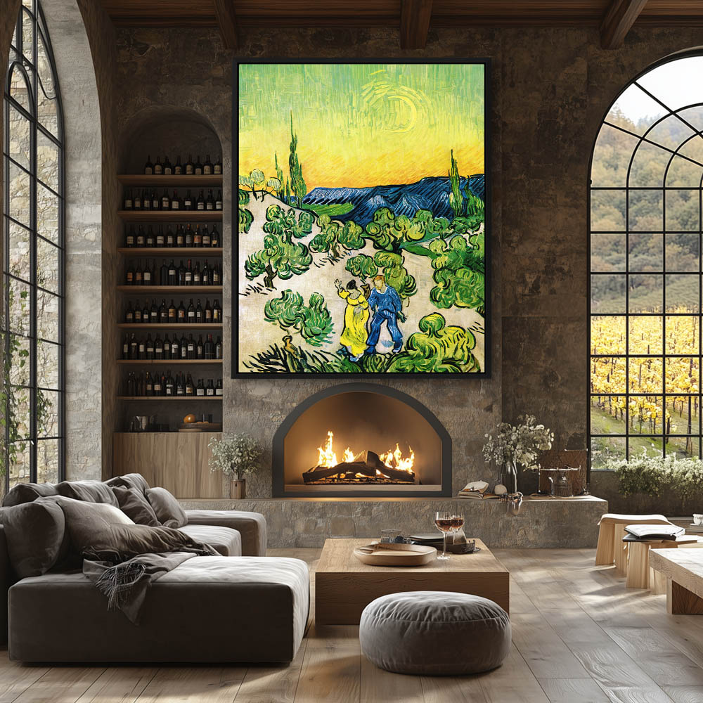 Impressionist Abstract Landscape Painting of Figures Walking under a Cresent Moon