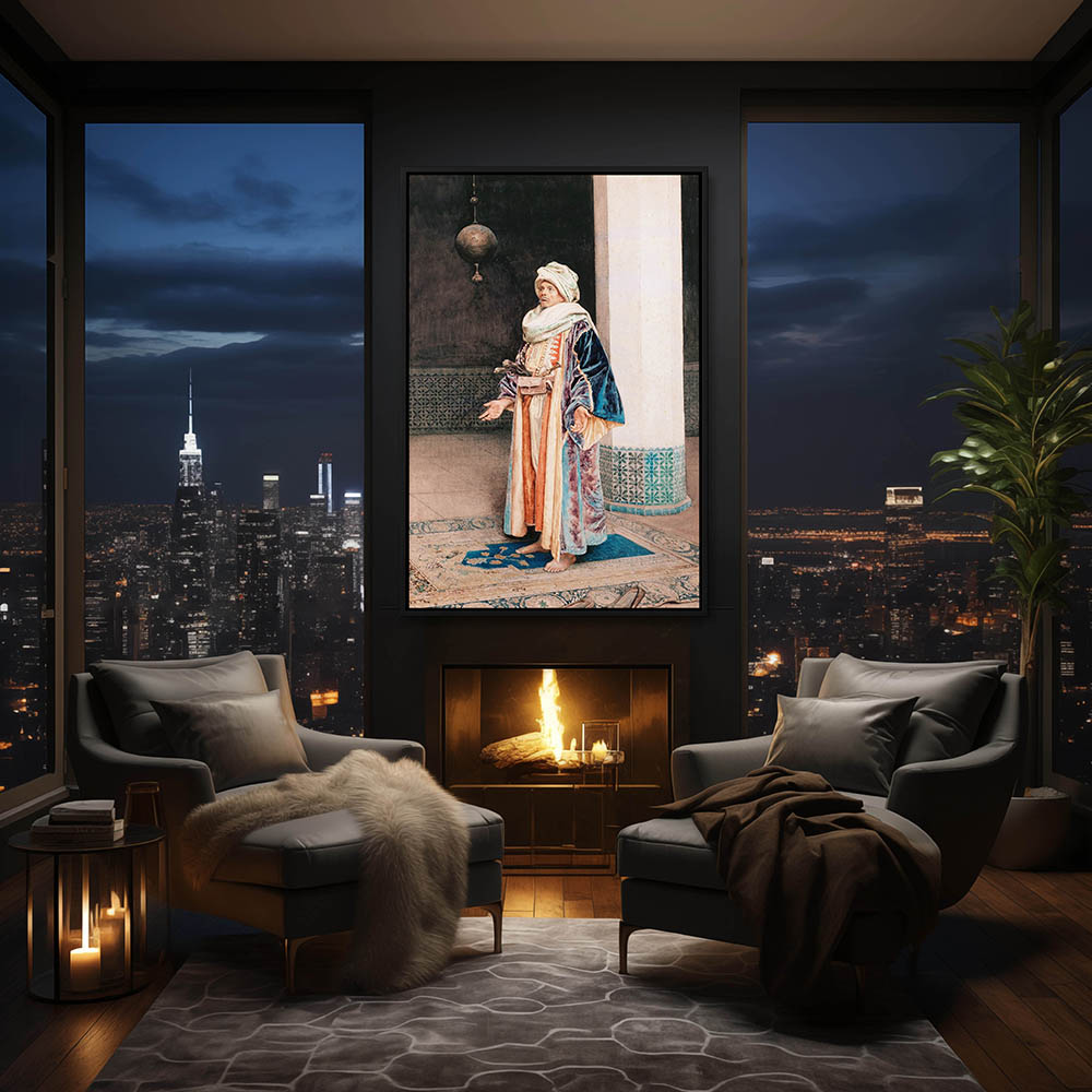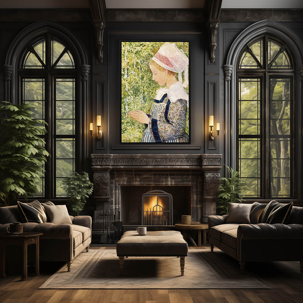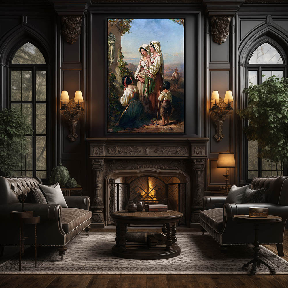 Vintage Figurative Painting with Girls Praying at a Shrine