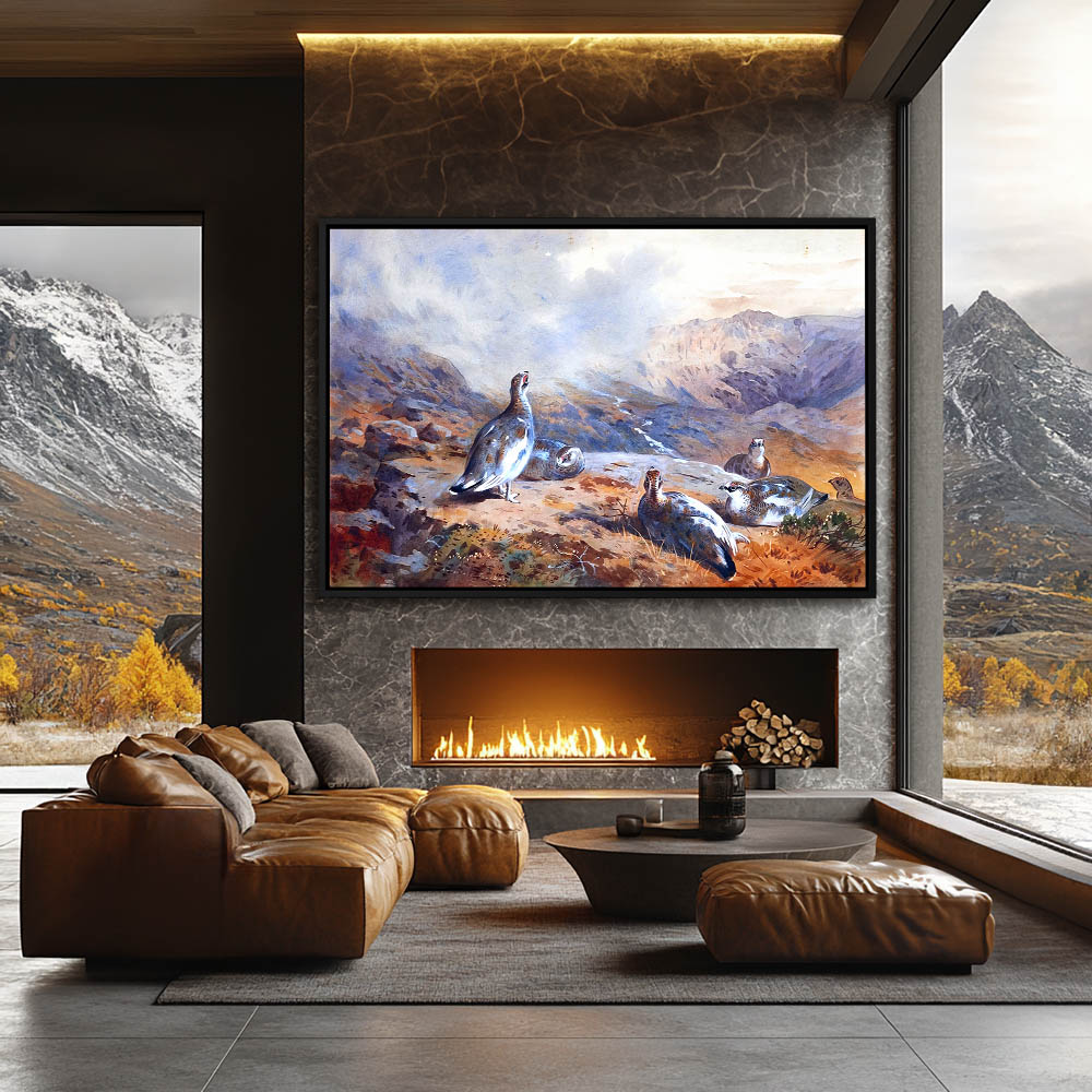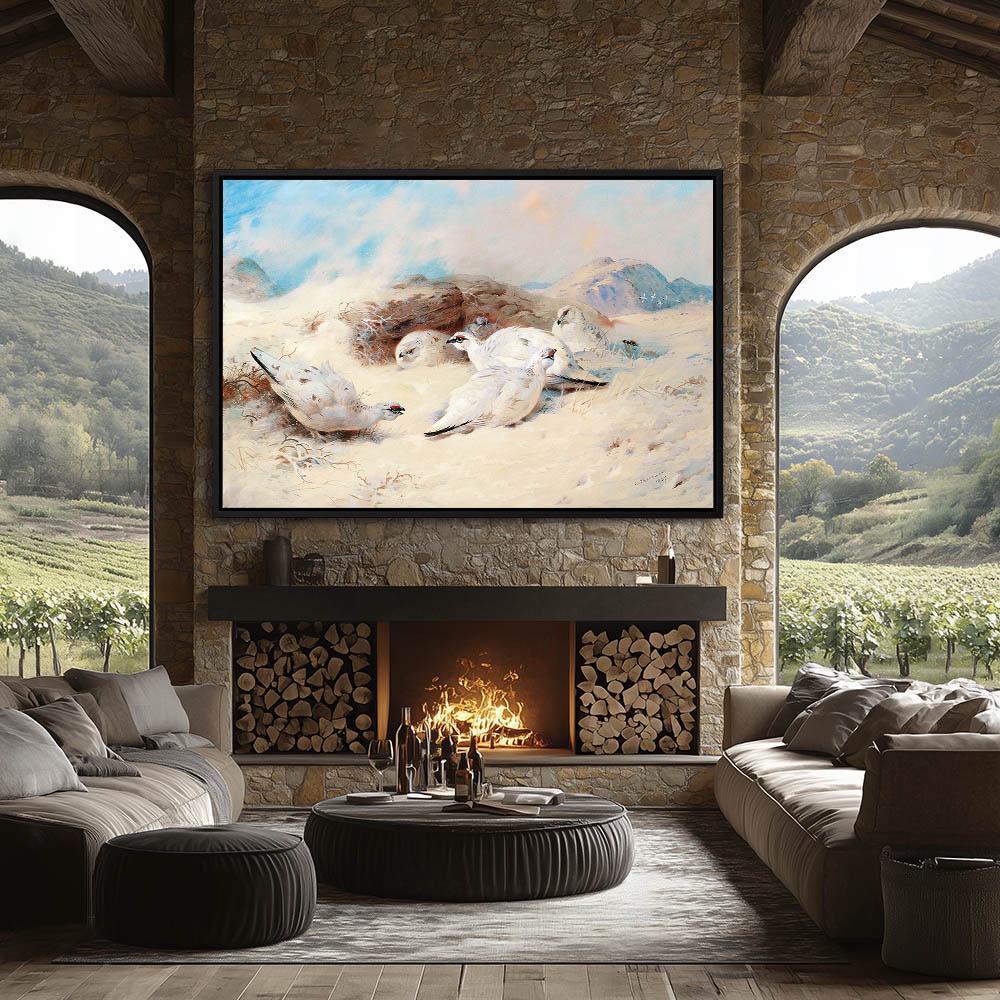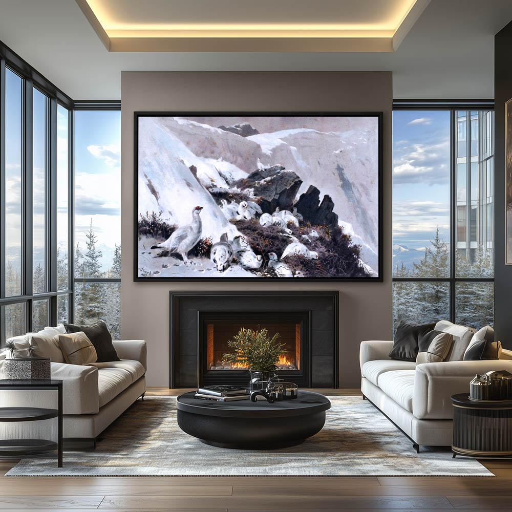 Snowy Mountainous Landscape Painting with Ptarmigan Gamebirds