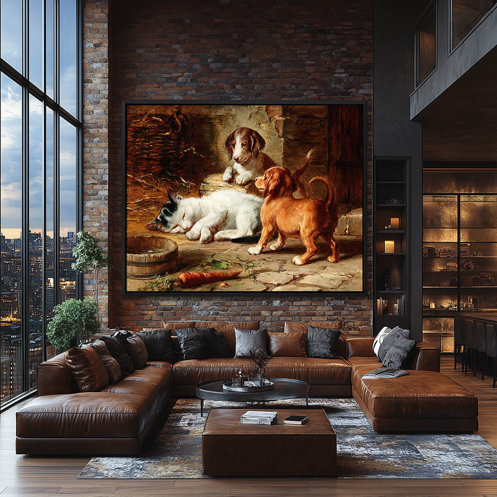 Two puppies and a sleeping kitten