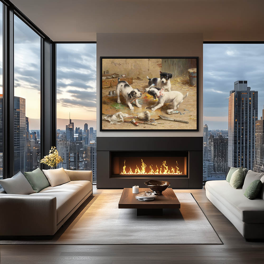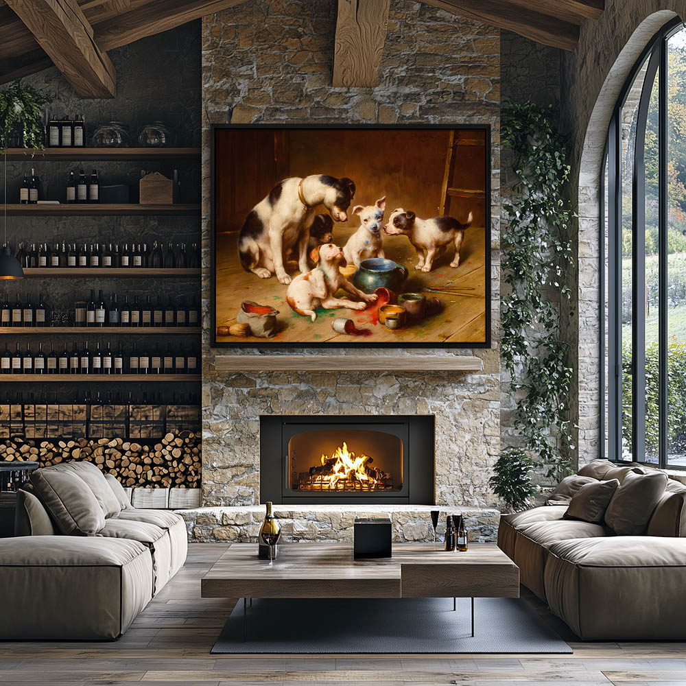 Puppies playing in painter’s supplies, fighting over a paint brush