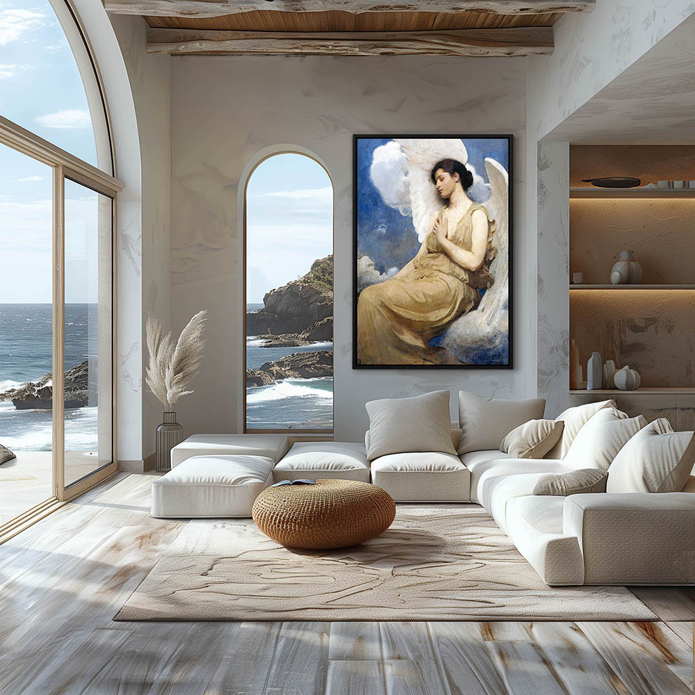 Vintage Figurative Painting of a Winged Angel Seated on a Cloud