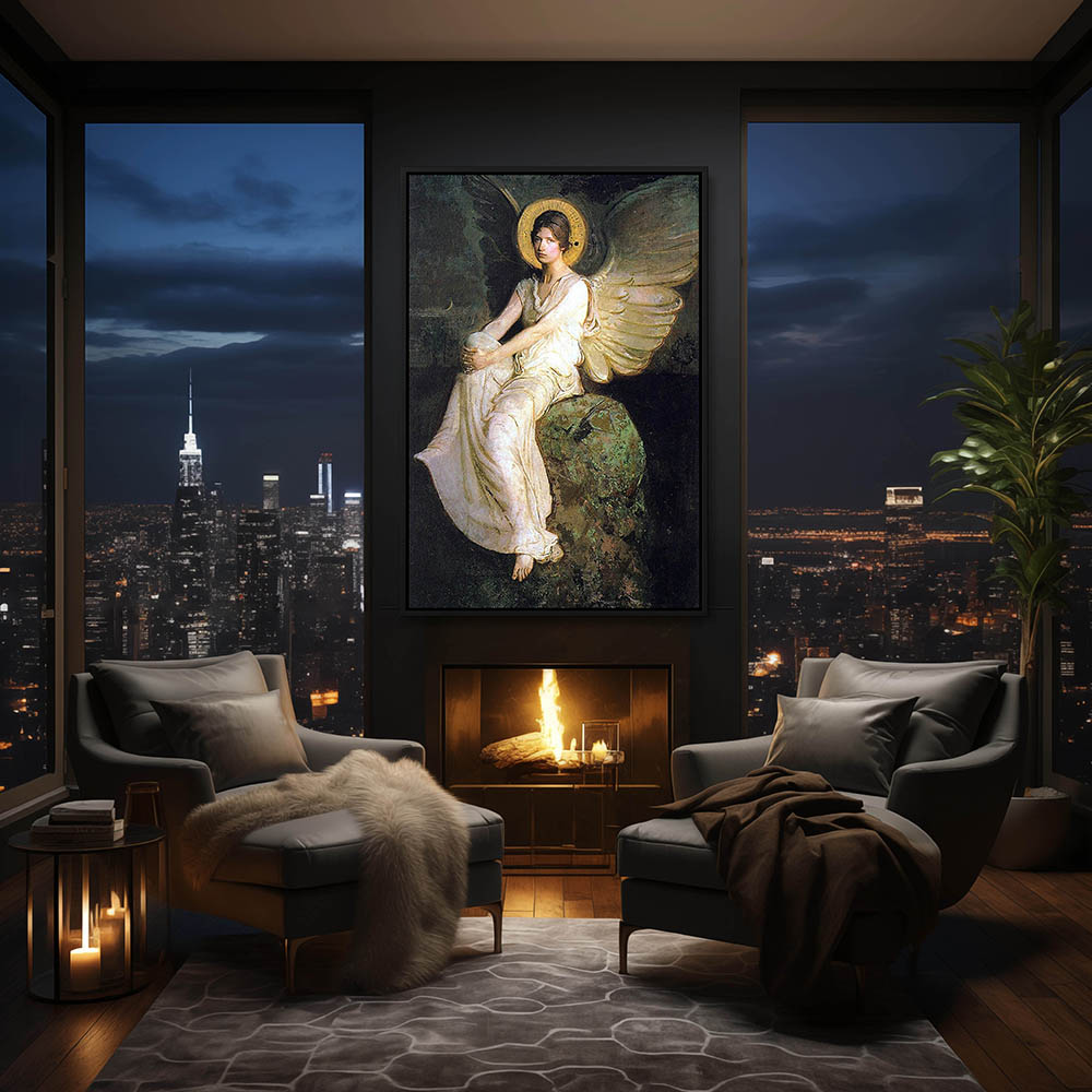 Vintage Figurative Painting of a Seated Angel on a Rock