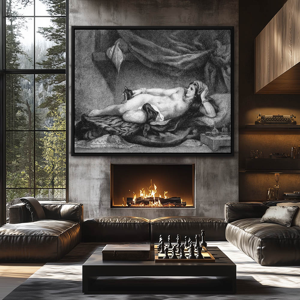 Vintage Figurative Drawing of a Nude Woman Laying on the Bed
