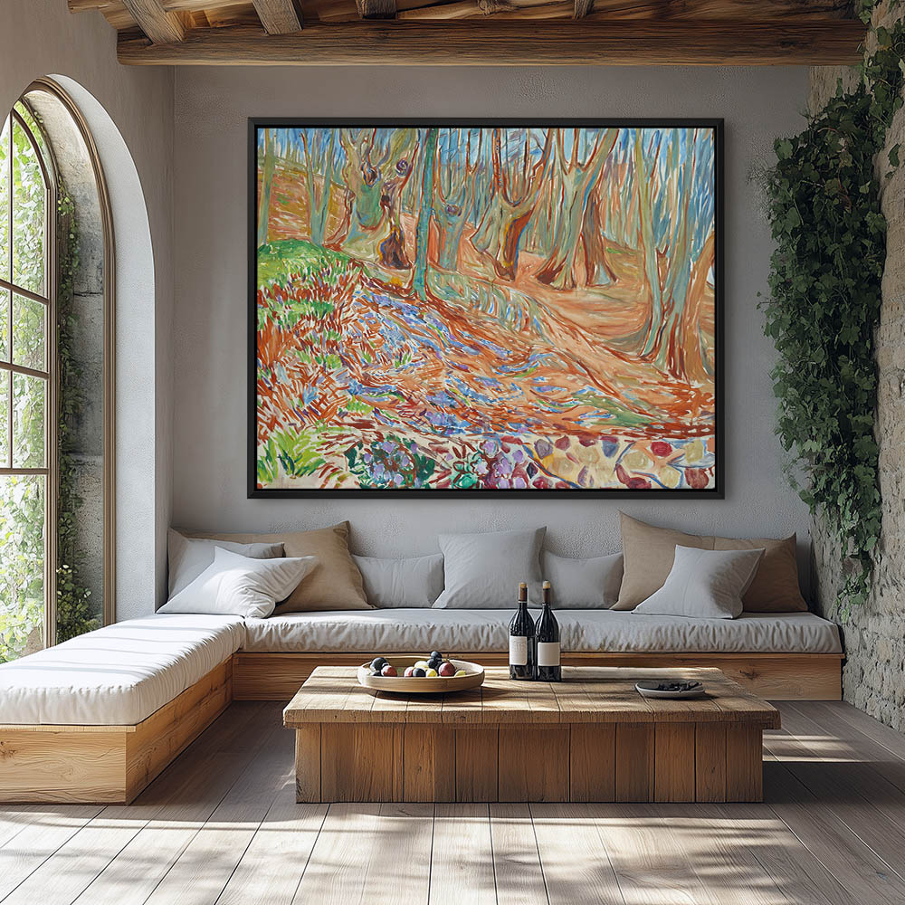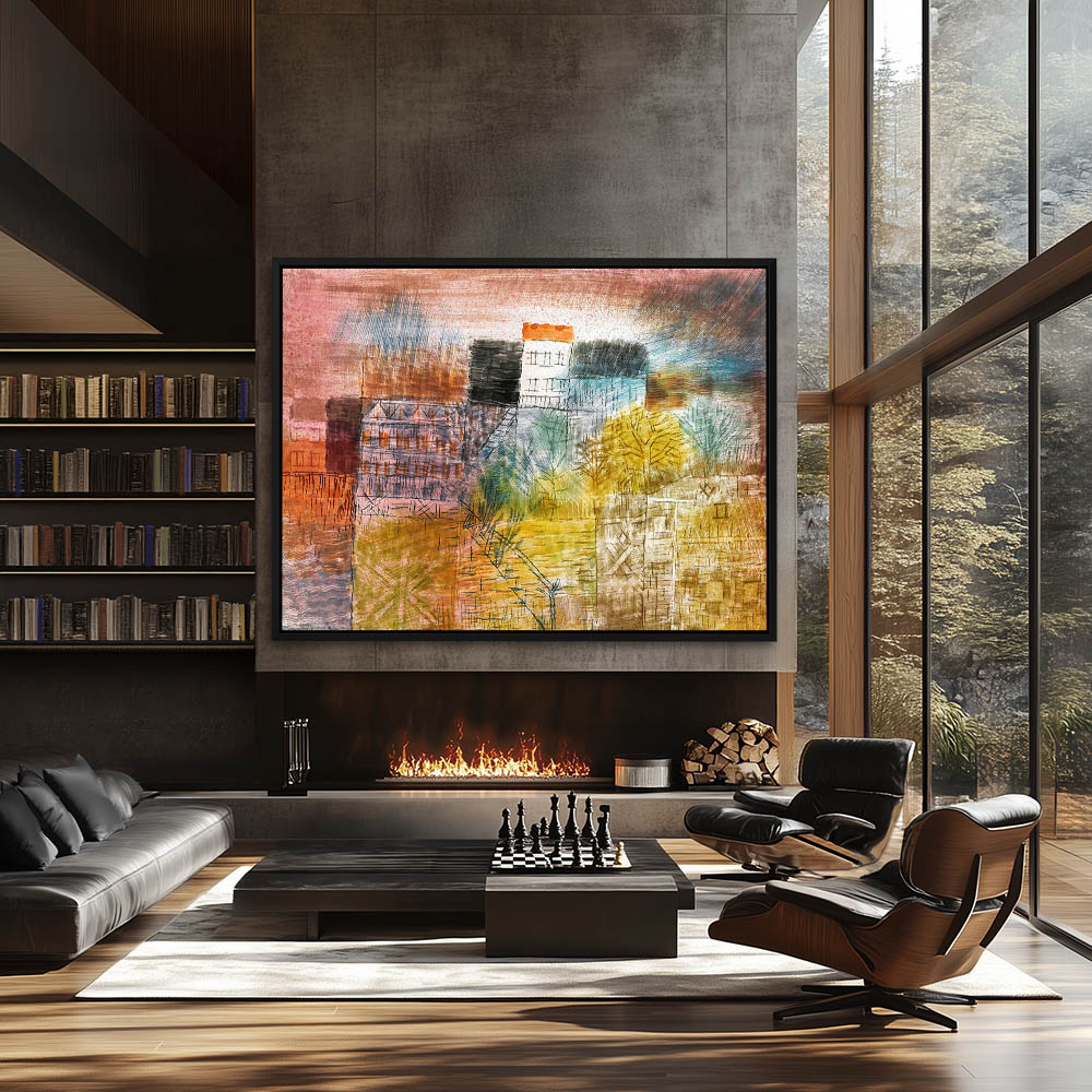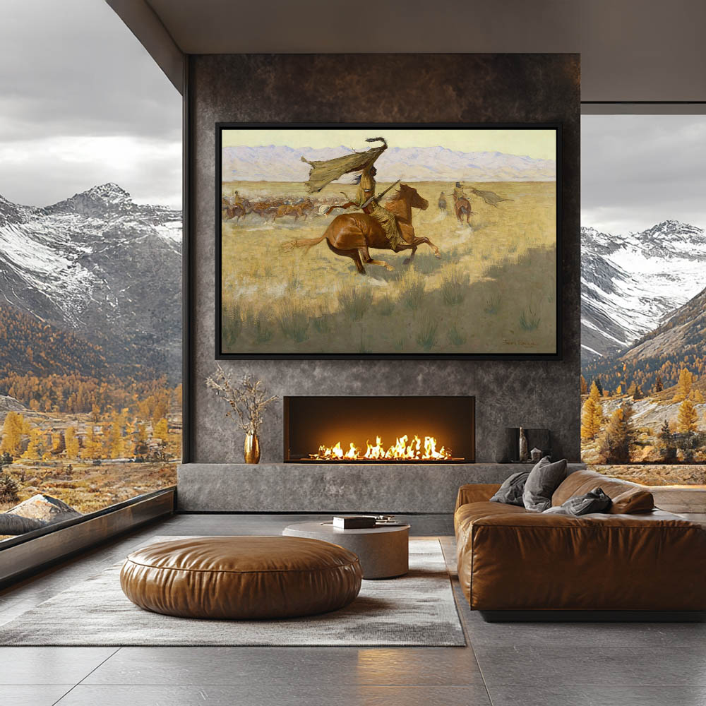 Landscape with Indians on hourseback at the riverbank, a village and mountains in the distance.