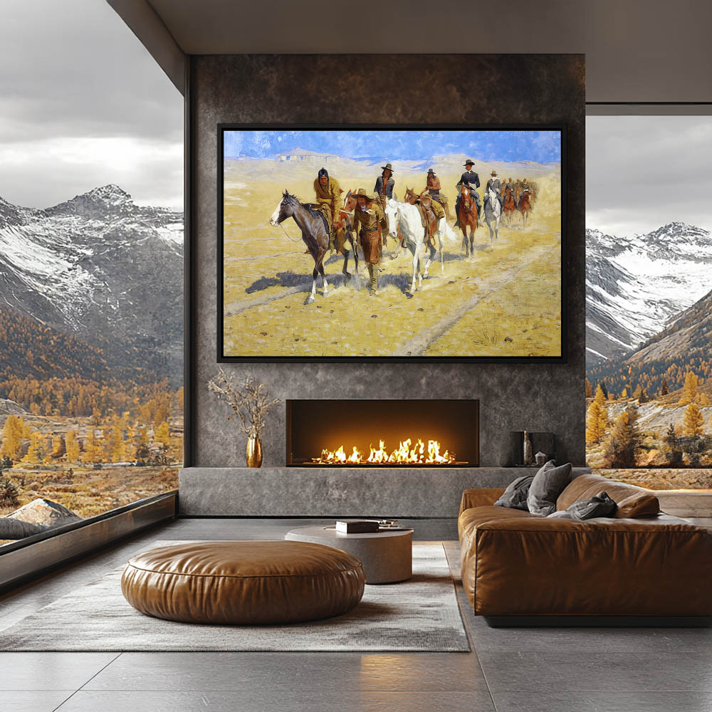 Indian scouts with soldiers, pointing out tracks among the buffalo trail