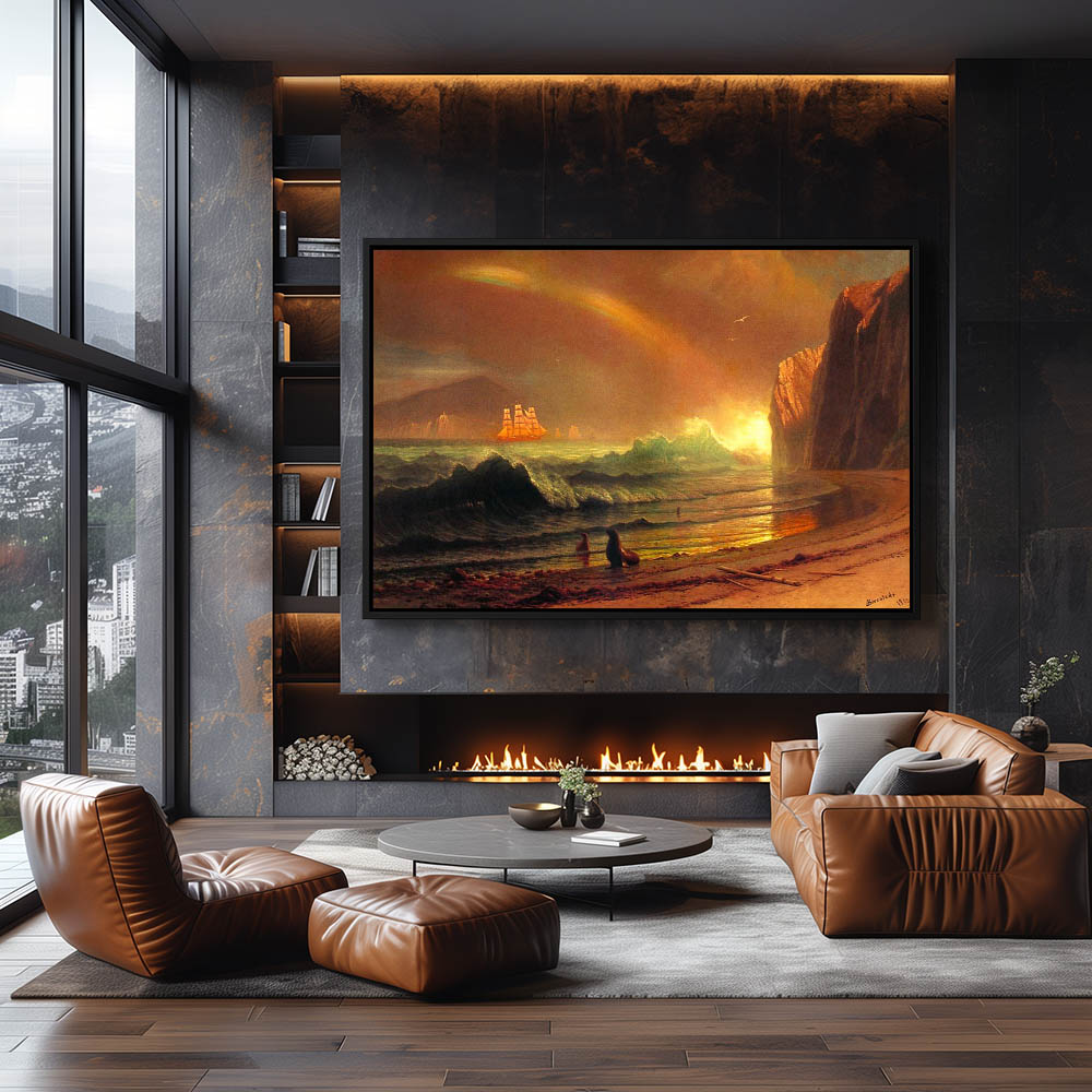 Rainbow over a ship sailing on the ocean at sunset with waves crashing on the beach with seals