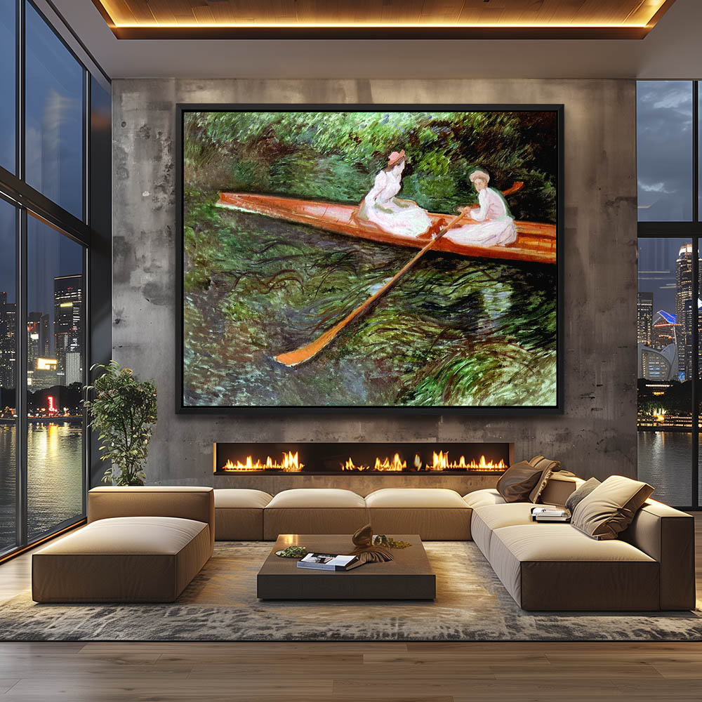 Vintage River Landscape Painting with two Girls Rowing in a Skiff
