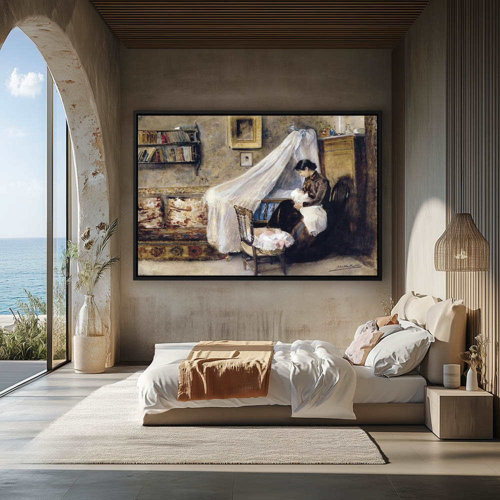 Woman holding a baby next to a crib draped in white gauze