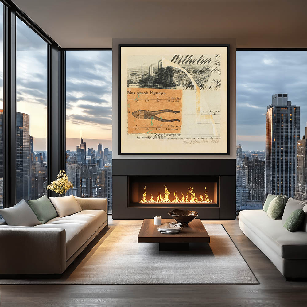 Abstract collage with double exposed print, hand tool specs and newsprint
