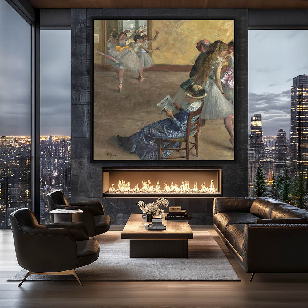 Ballerinas in class with an instructor and a mother reading the paper while she waits