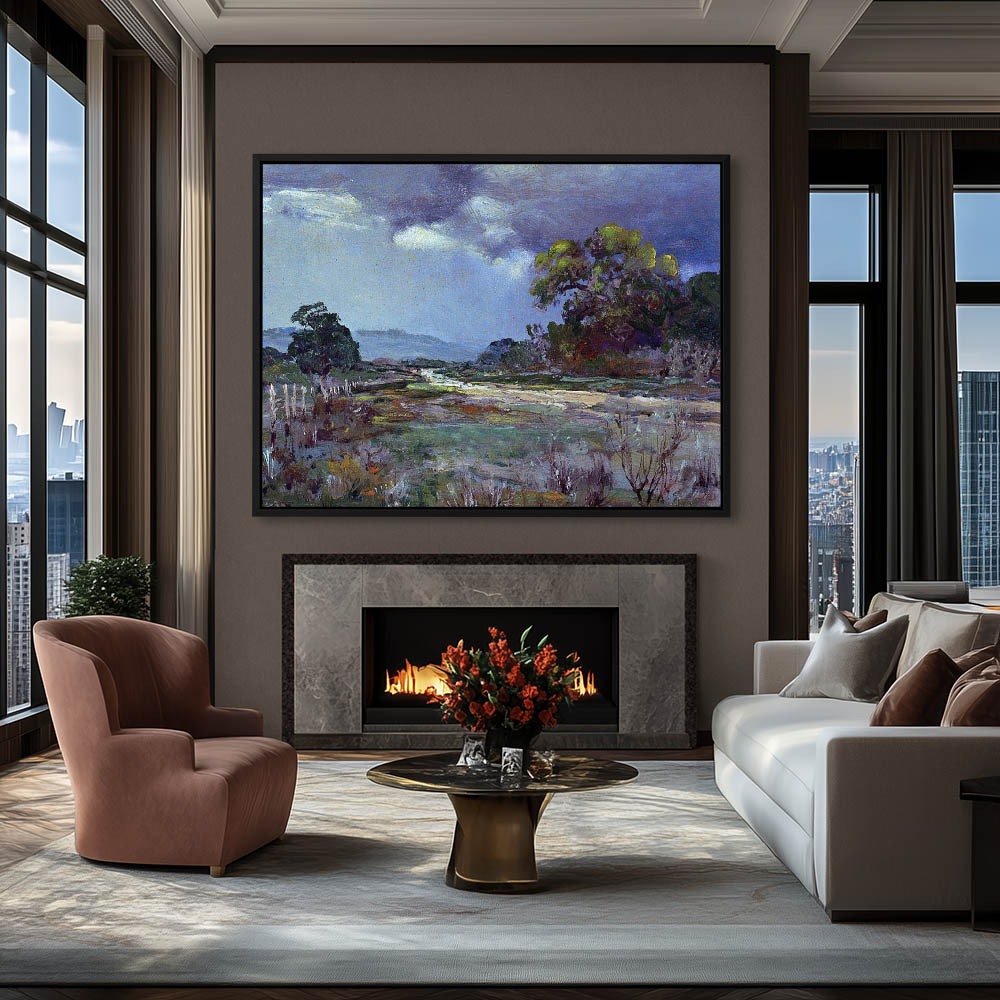 Landscape with a scattering of trees, mountains in the distance and storm clouds overhead