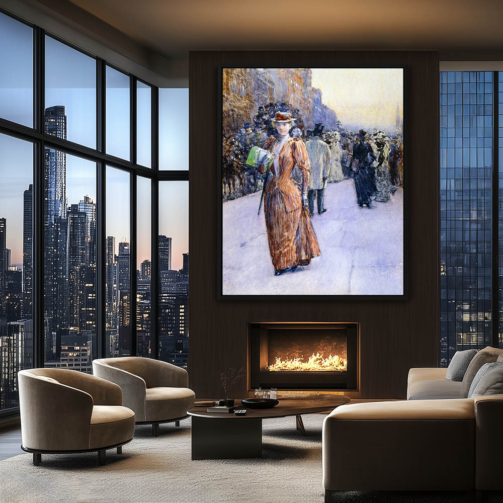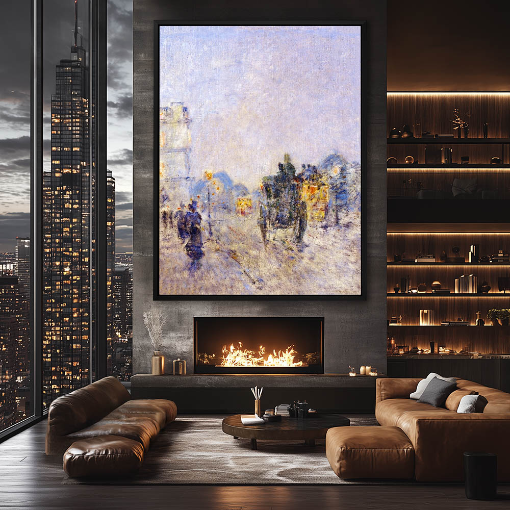 Horse drawn cabs waiting along the sidewalk as people pass by