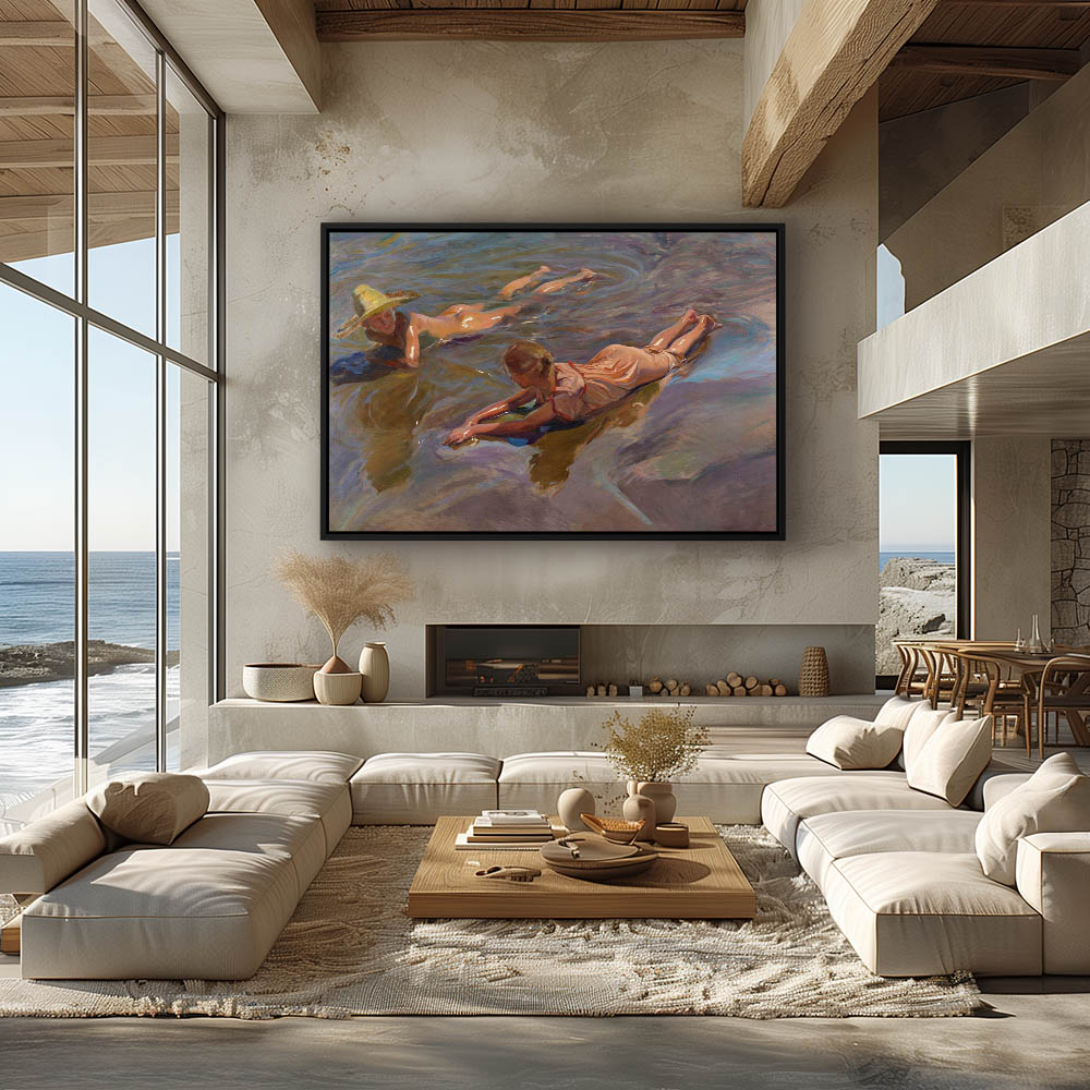 Children playing in the ocean as the sun glints off the surface