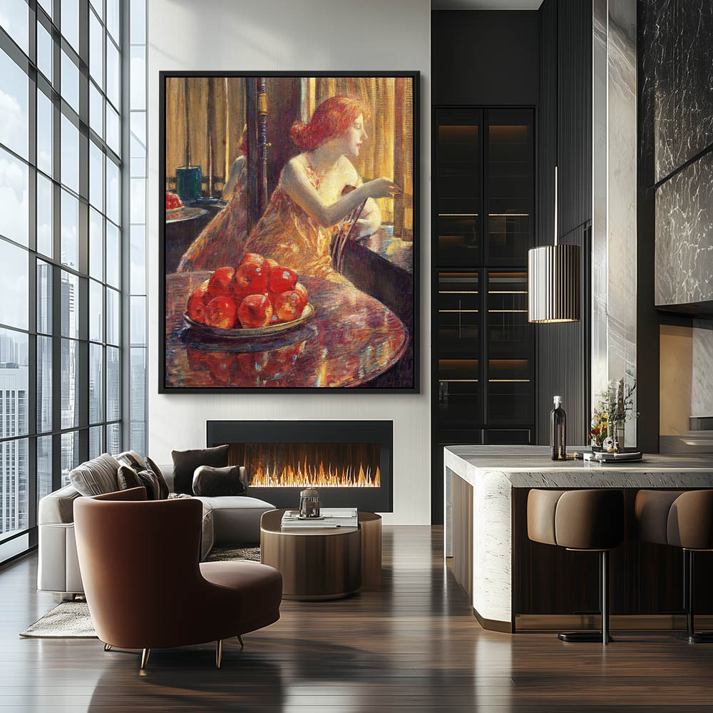 Woman looking out a sunlit window next to a bowl of apples
