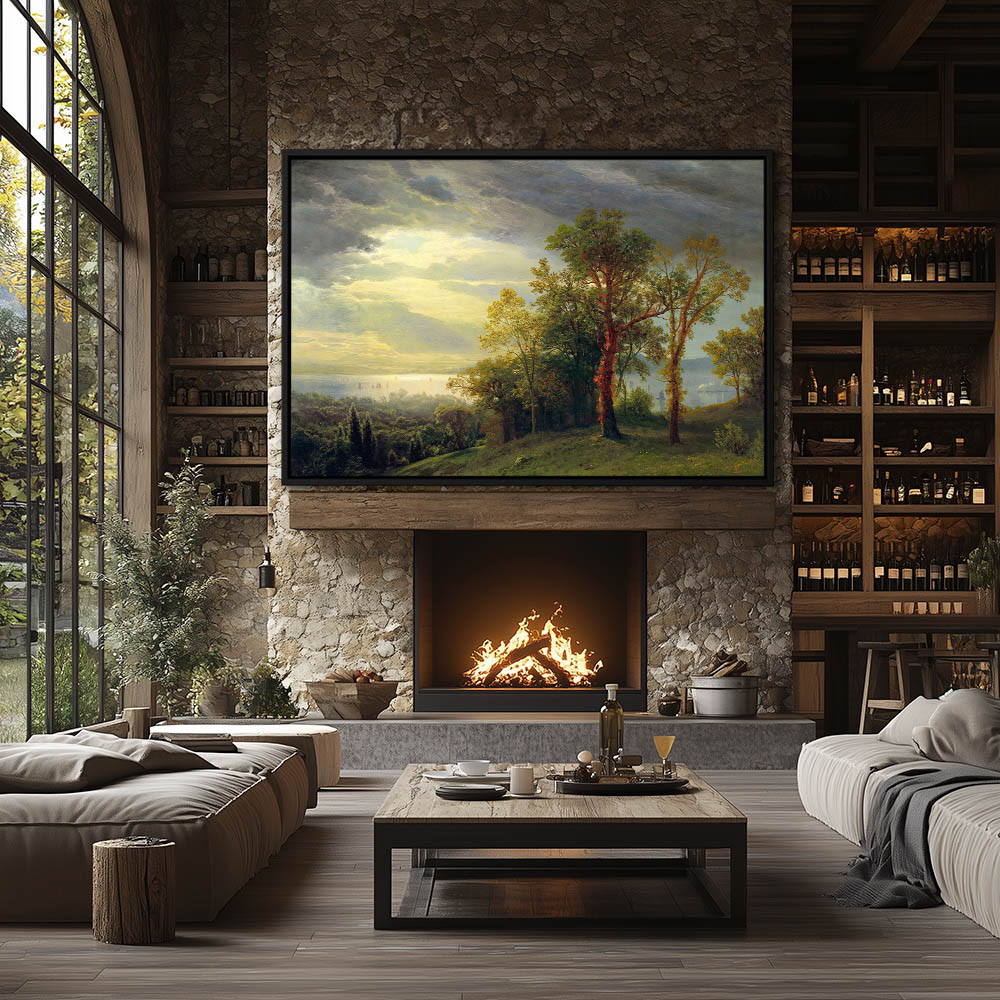 View of the river through the hilltop trees with the sun breaking through the clouds and reflecting off the surface of the water