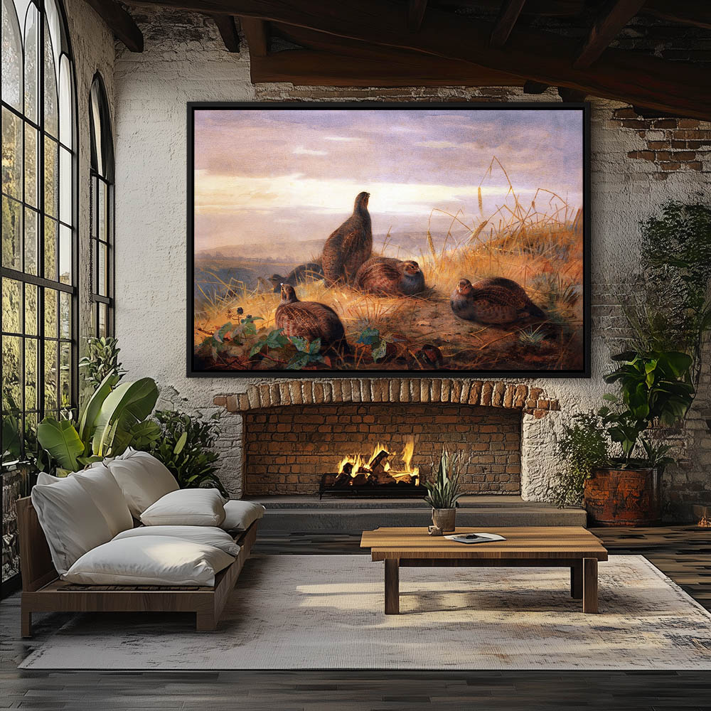 Painting of Red Grouse Resting on a Hill at Sunset