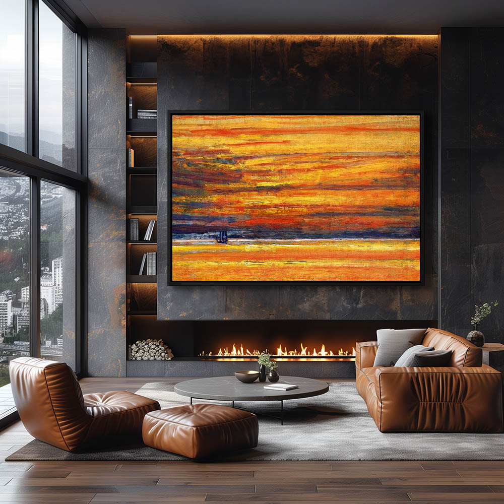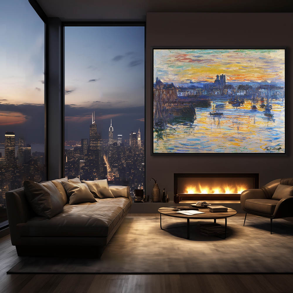 Vintage Seascape Painting of a Boat Harbor at Sunset