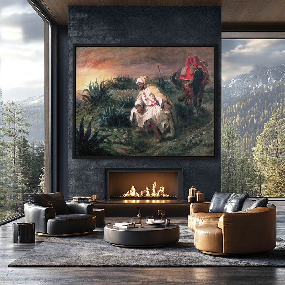 Vintage Figurative Painting with a Horse and Rider at the Tomb at Sunset