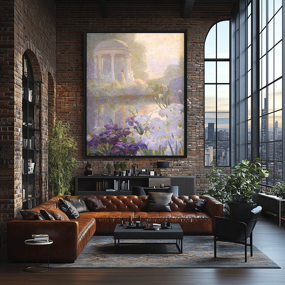 Vintage Flower Painting with Two Ladies in the Gazebo at Sunset