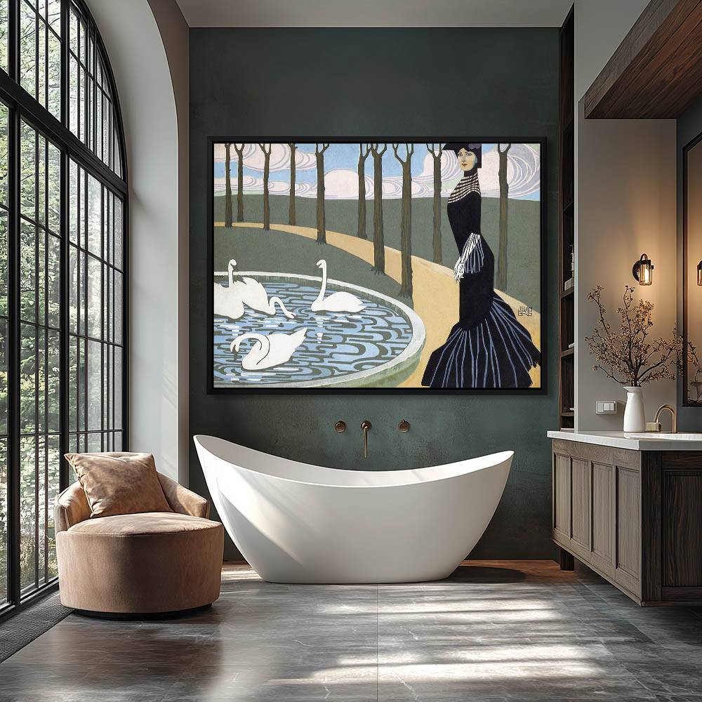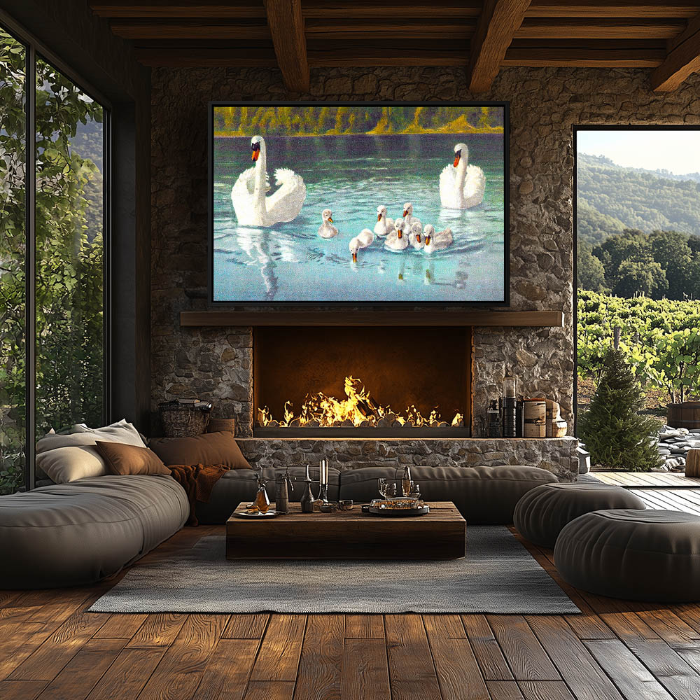 Painting of Swans in the Water and Walking on Shore