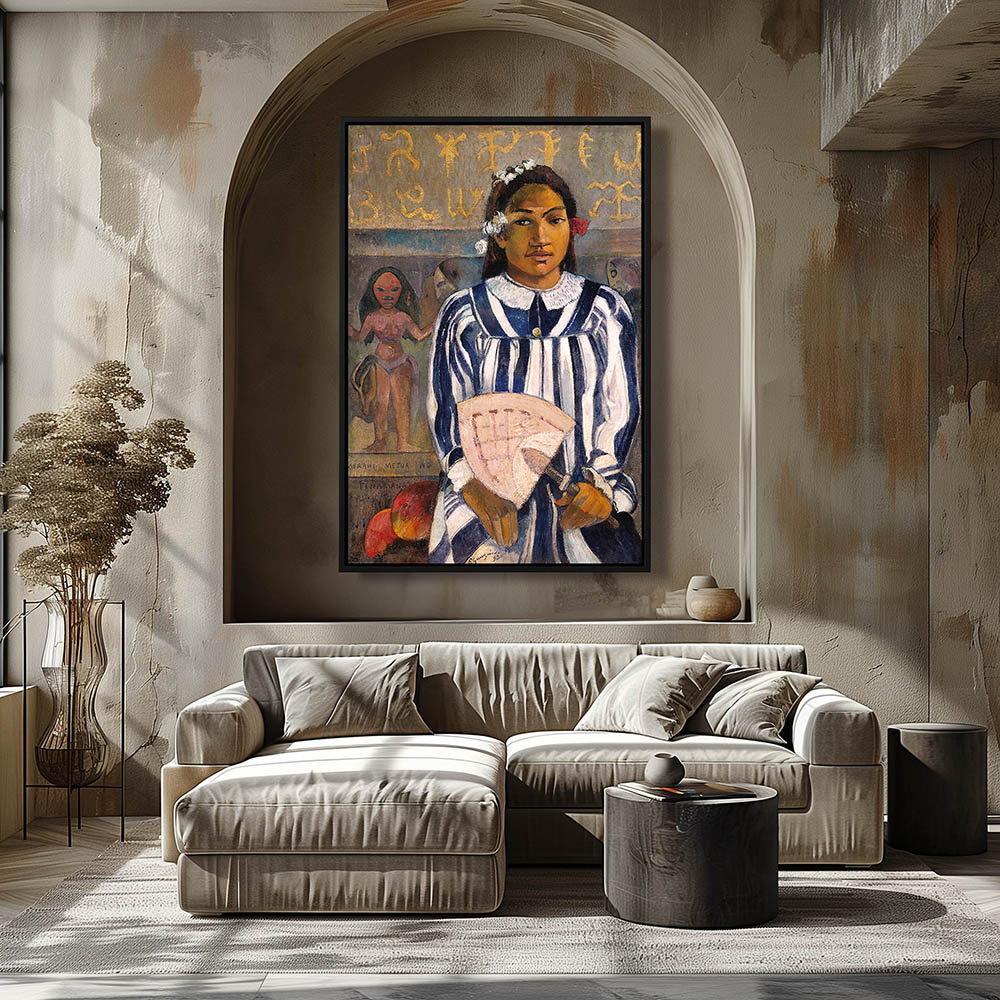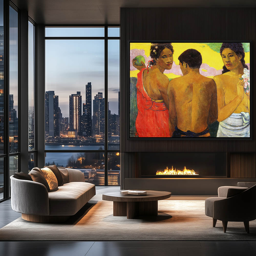 Vintage Figurative Painting of Two Tahitian Women and a Man