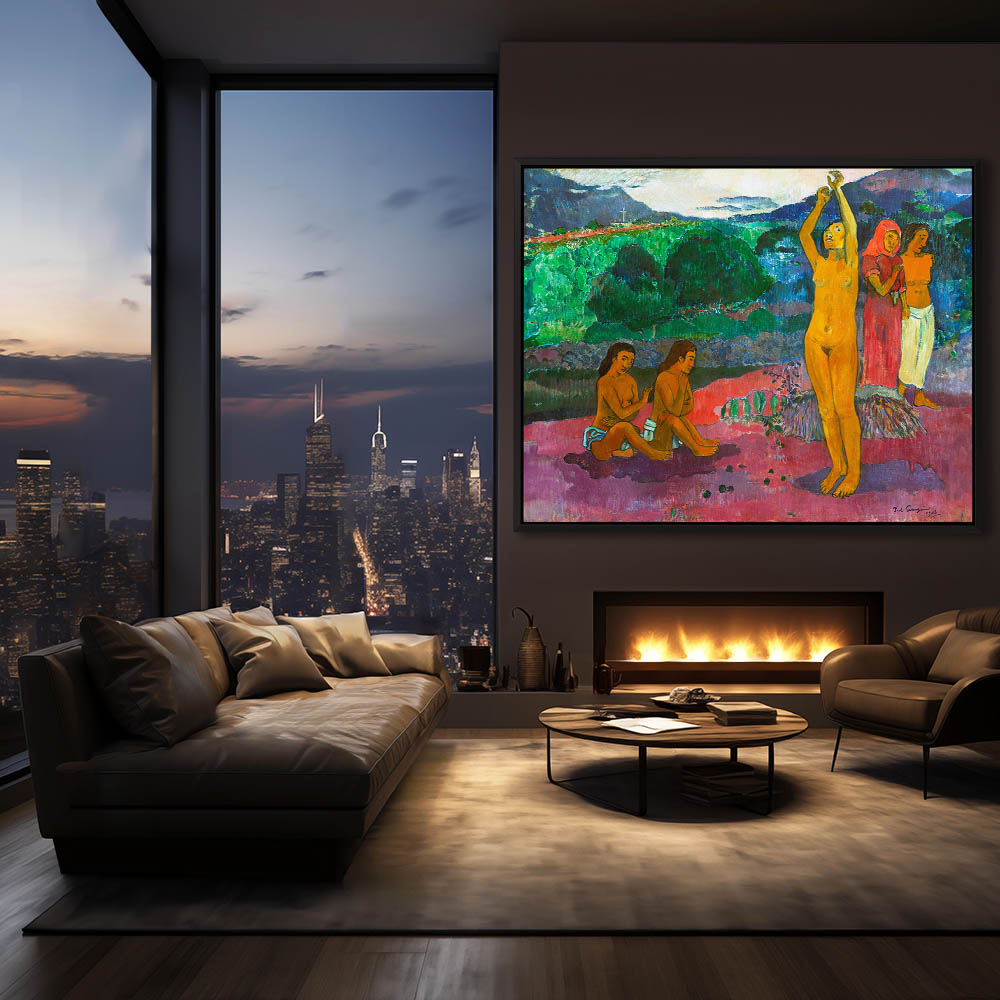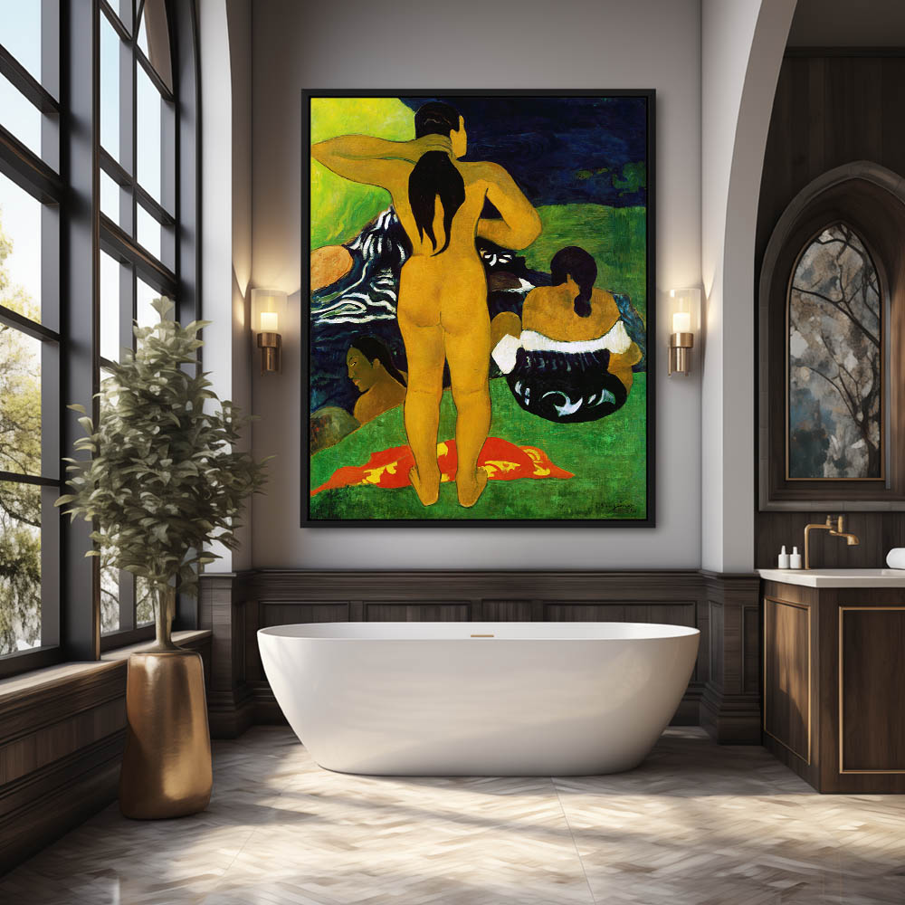 Vintage Abstract Figurative Painting of Nude Tahitian Women Bathing
