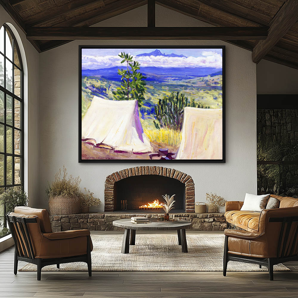 African Landscape Painting Overlooking a Valley with Two Tents