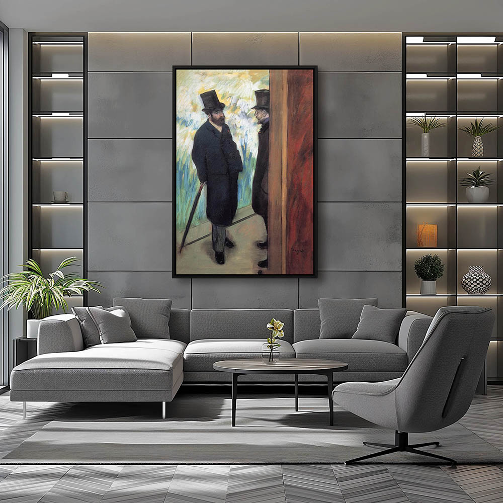 Two men seen around a corner speaking to one another with top hat and walking stick