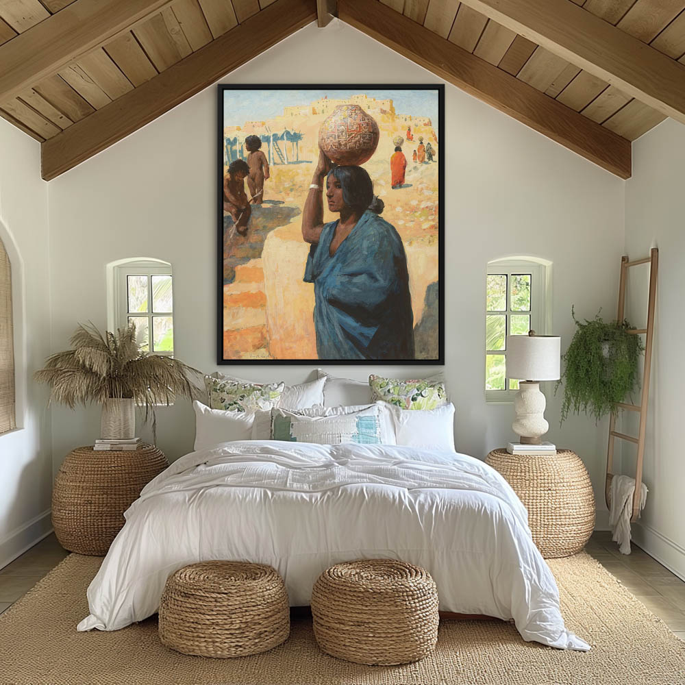 Hopi Indian woman with a decorative vase balanced on her head, other women with vases visible in the background as well as children and the village