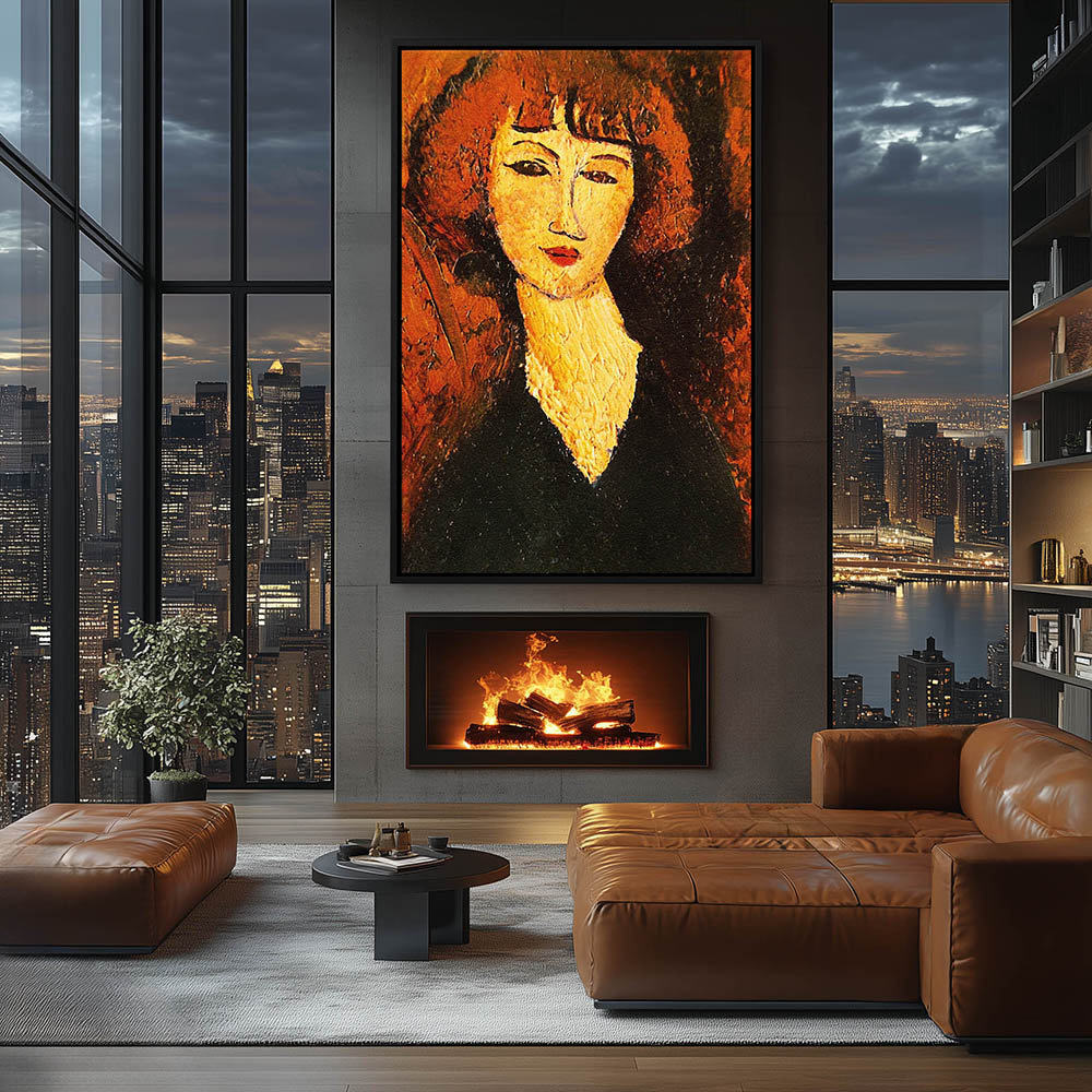 Abstract Figurative Woman in Black Blouse Red Hair on Orange Background