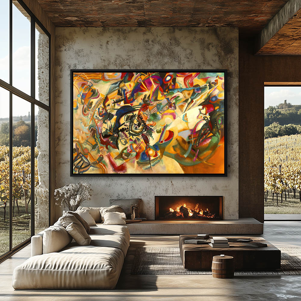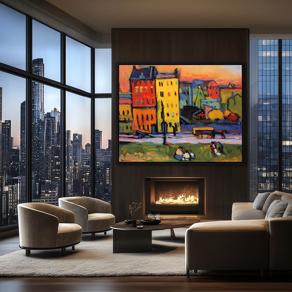 Colorful City view, figures siting in the grass with a horsedrawn cart on the street and houses lining the far side