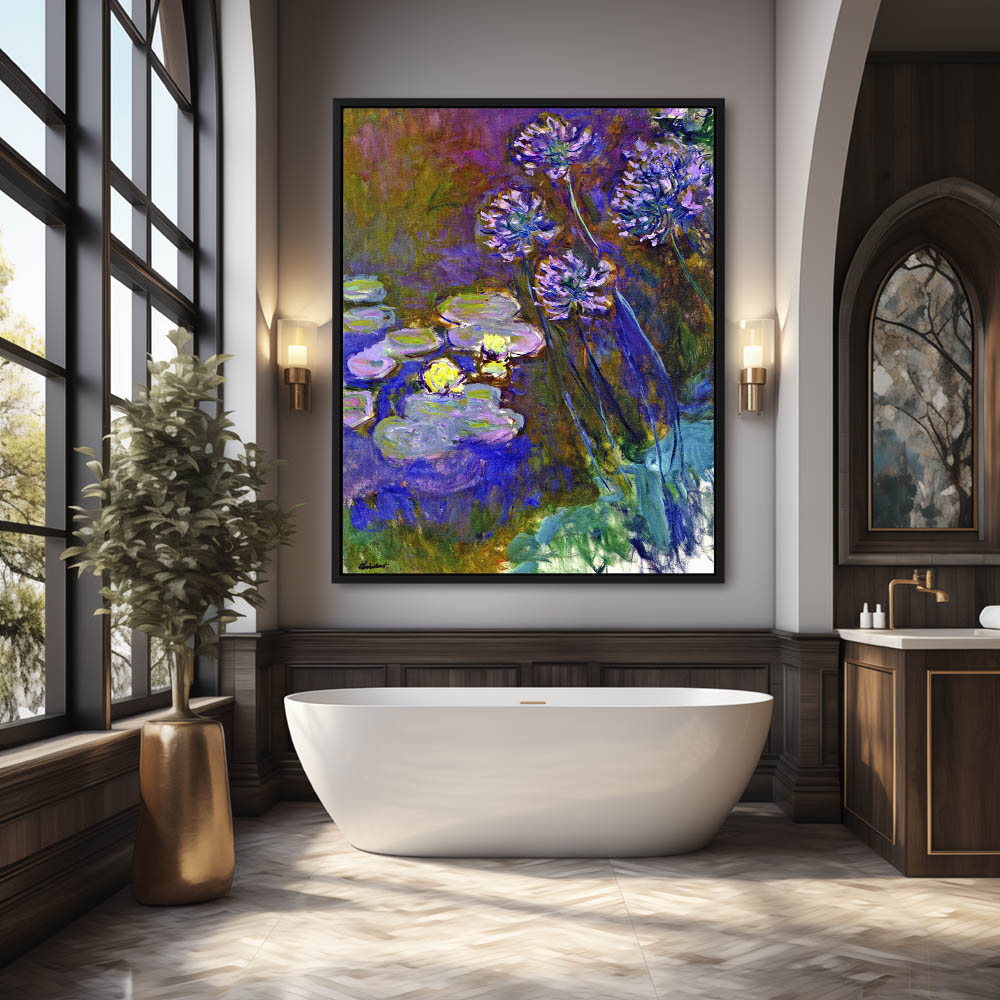 Vintage Pond Painting of Watter Lillies with Flowers and Agapanthus