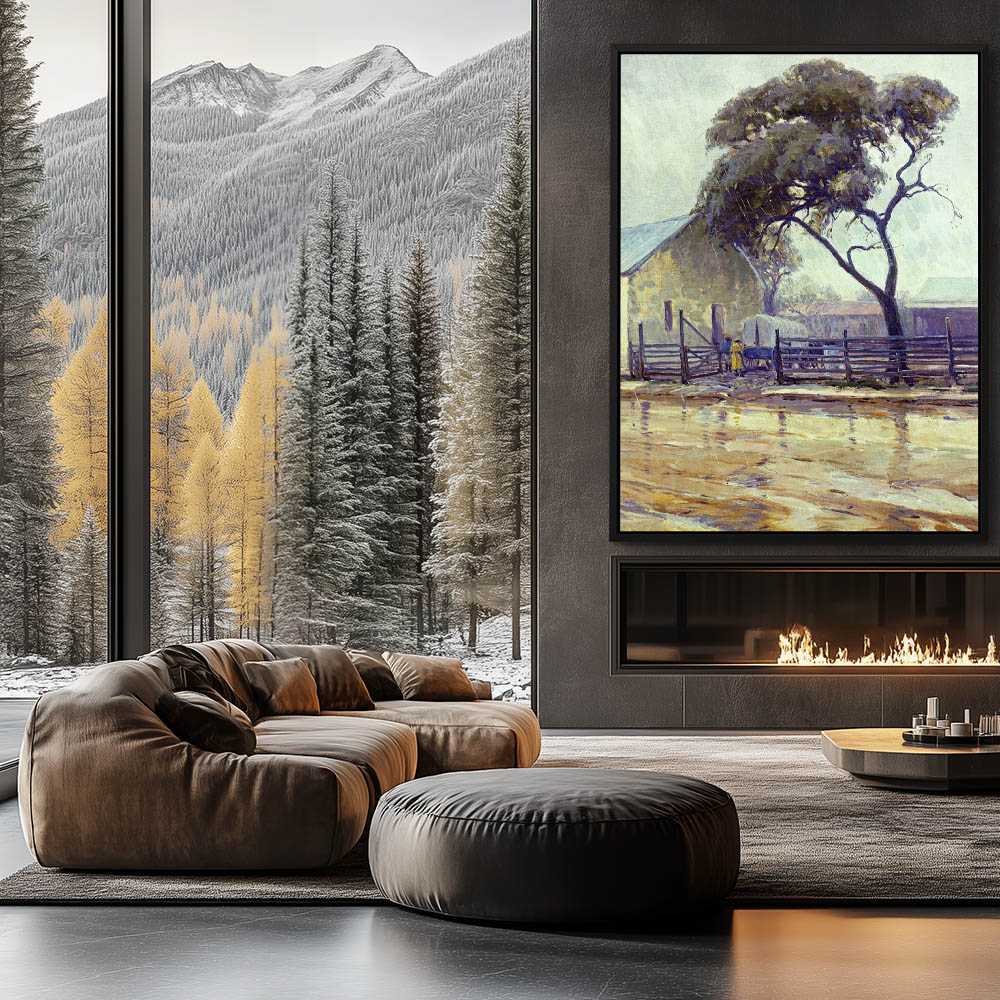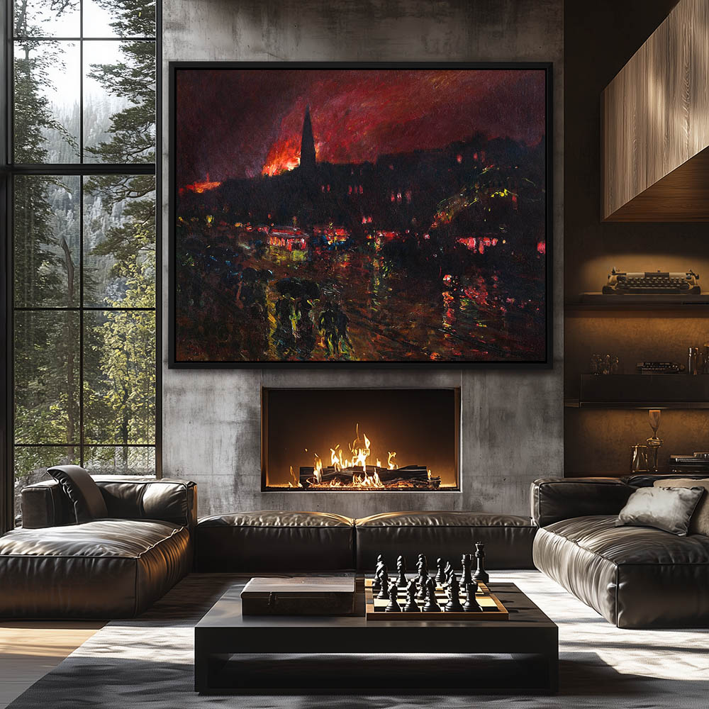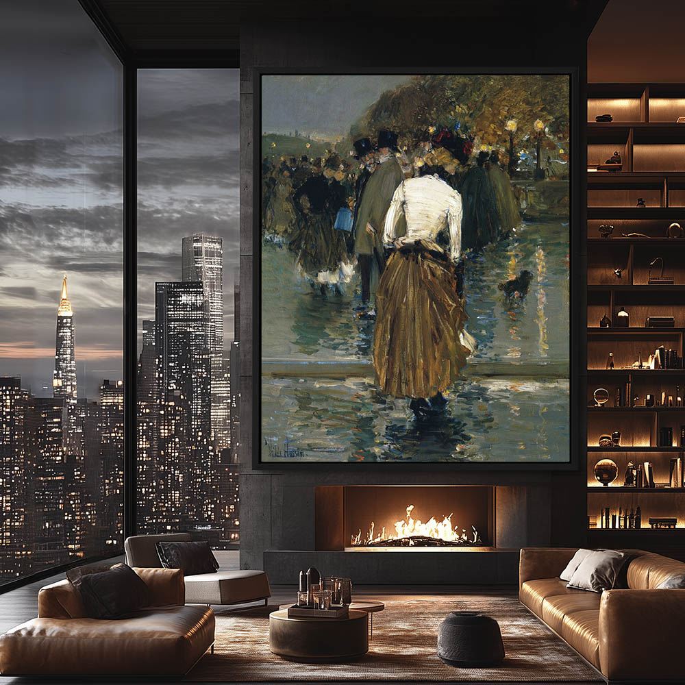 Evening walk with street lamps reflecting off the wet streets while women hold their hems up out of the water