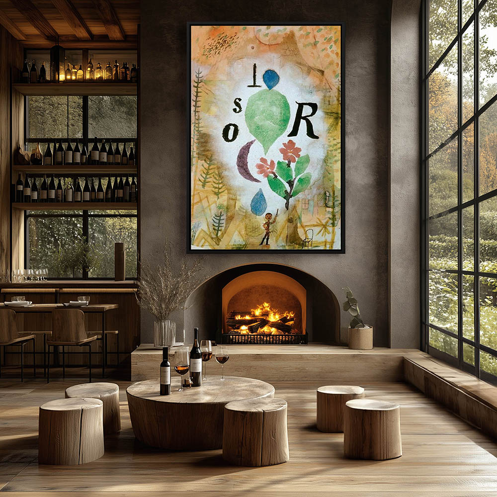 Abstract composition with a figure, plants, crecent moon and various objects