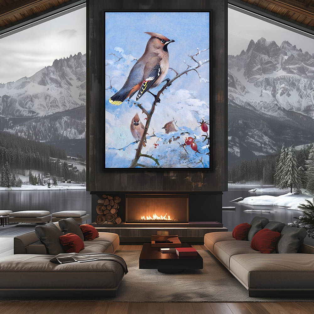 Painting of the Waxwing Birds Resting on a Rose Limb
