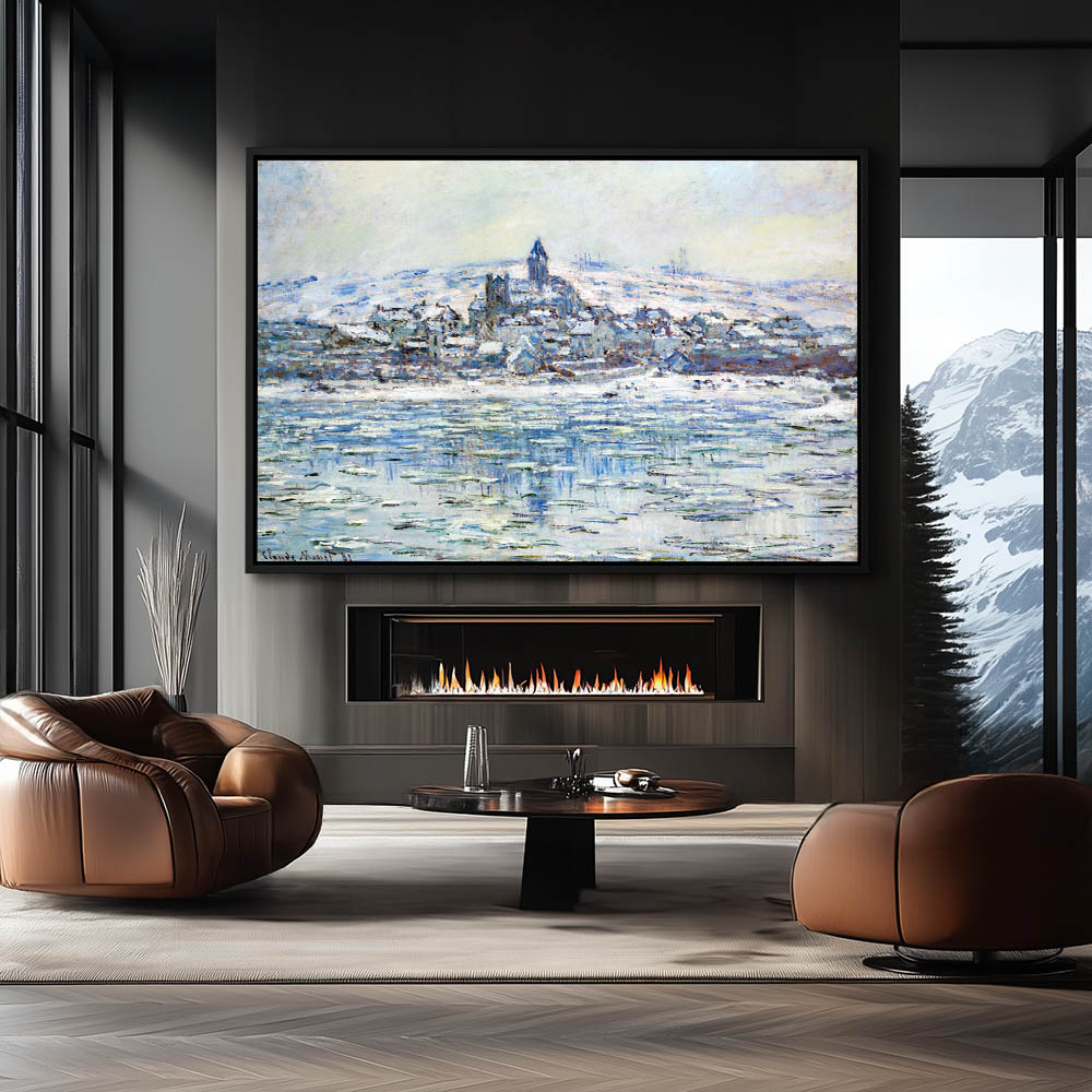 Vintage River Landscape Painting with Heavy Snow and Ice with a Village in the Distance