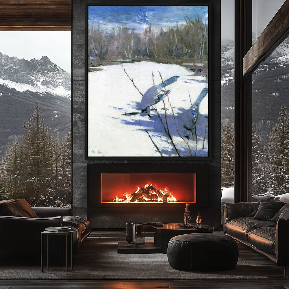Vintage Winter Landscape Painting with Blue Jays on a Limb in the Snow
