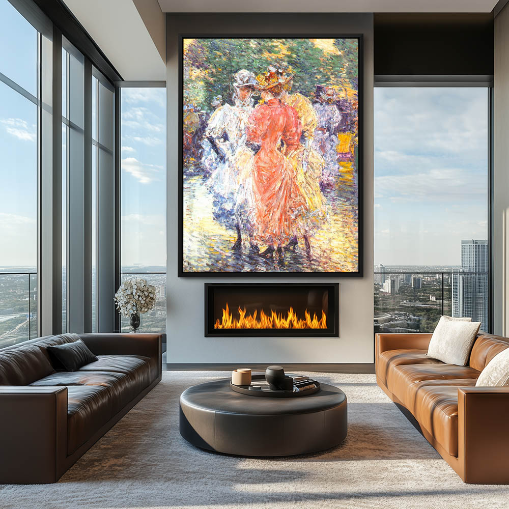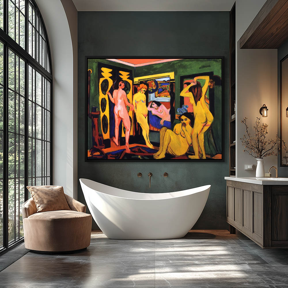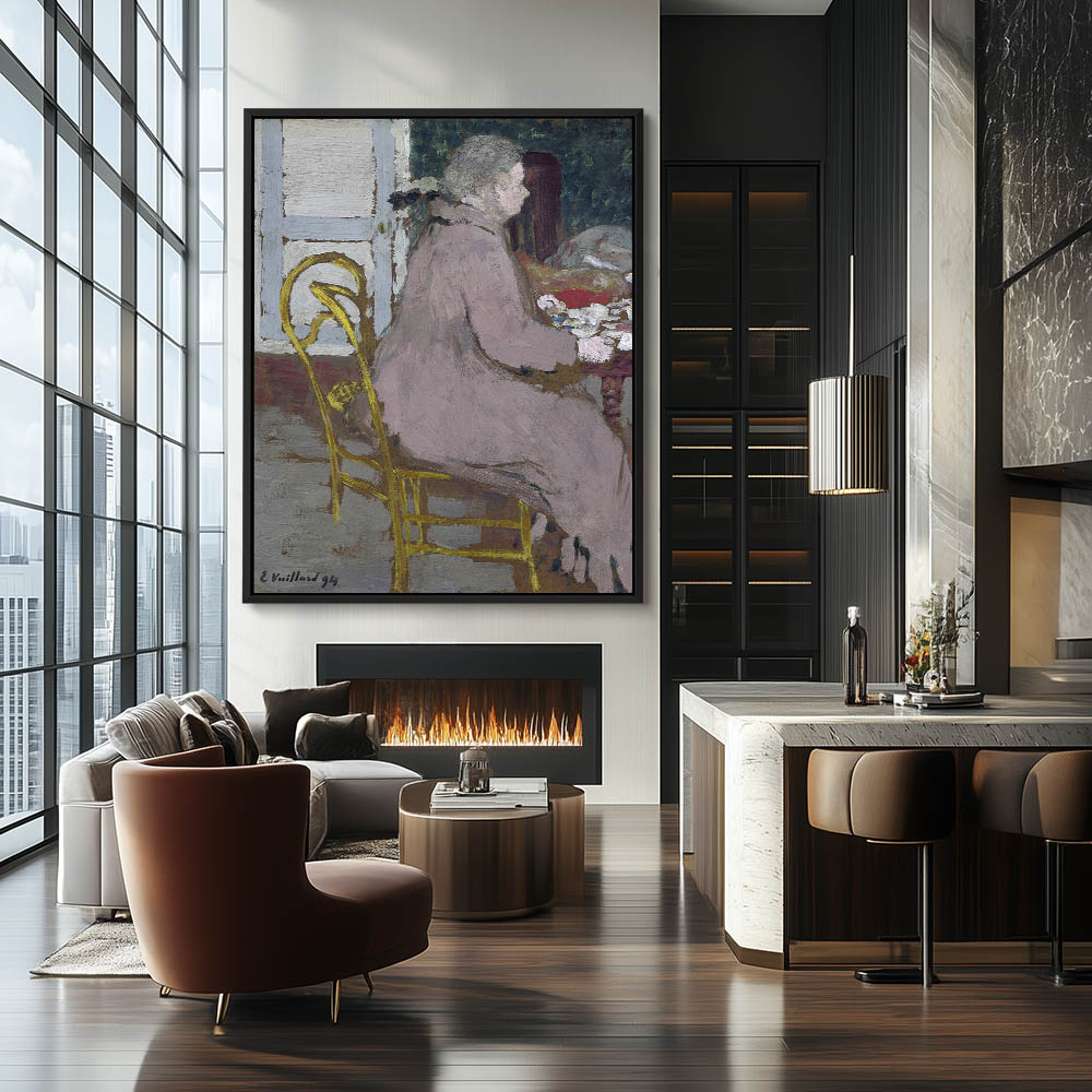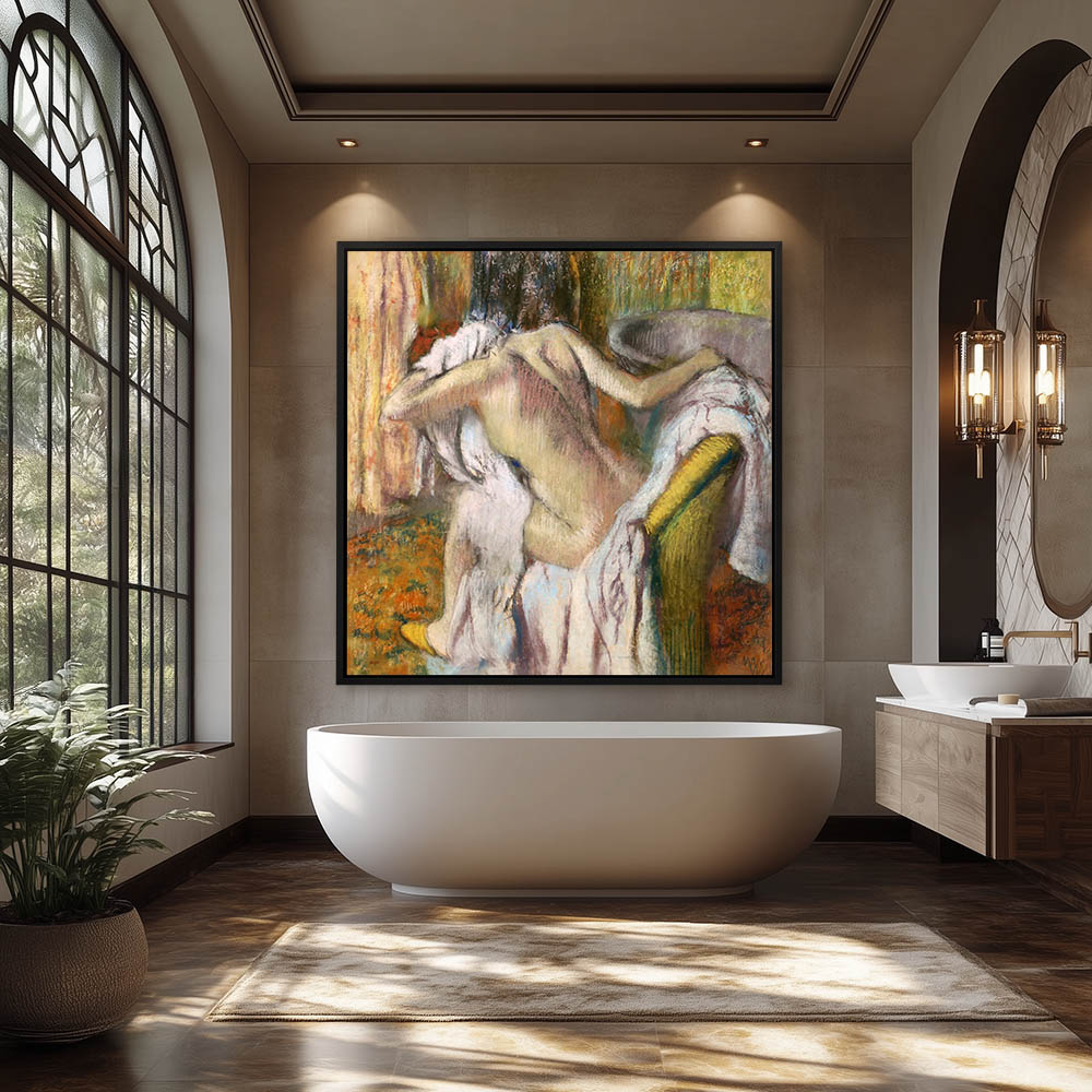 Woman seated in a chair next to the tub, wearing slippers and drying her hair after a bath