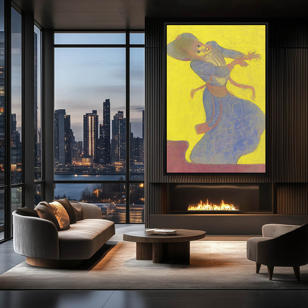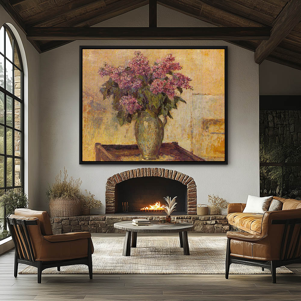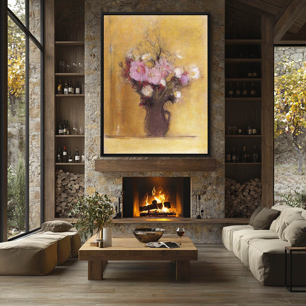 Abstract still life of pink and white flowres in a dark vase on a yellow background