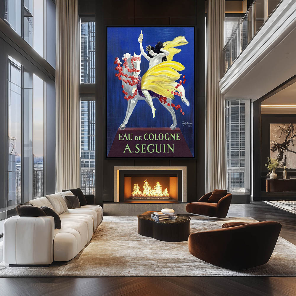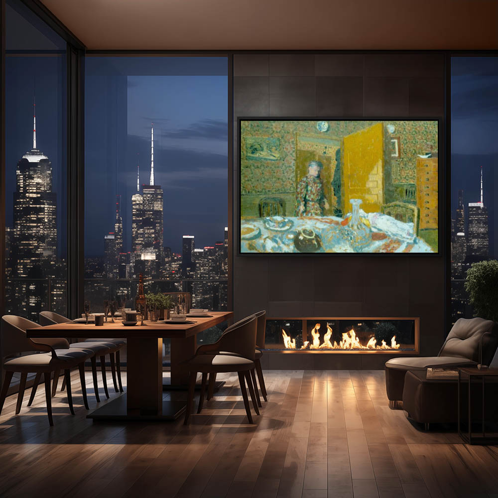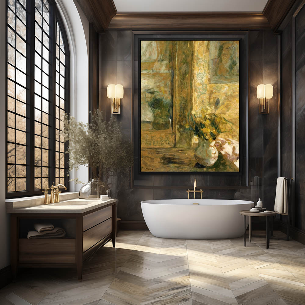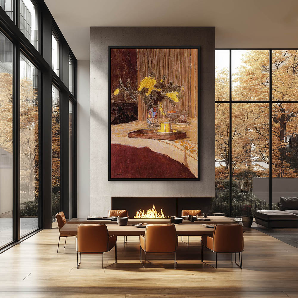 Still life pf a table with a decorative vase of yellow flowers, a tray with yellow cup and saucer and a glass bowl with oranges.