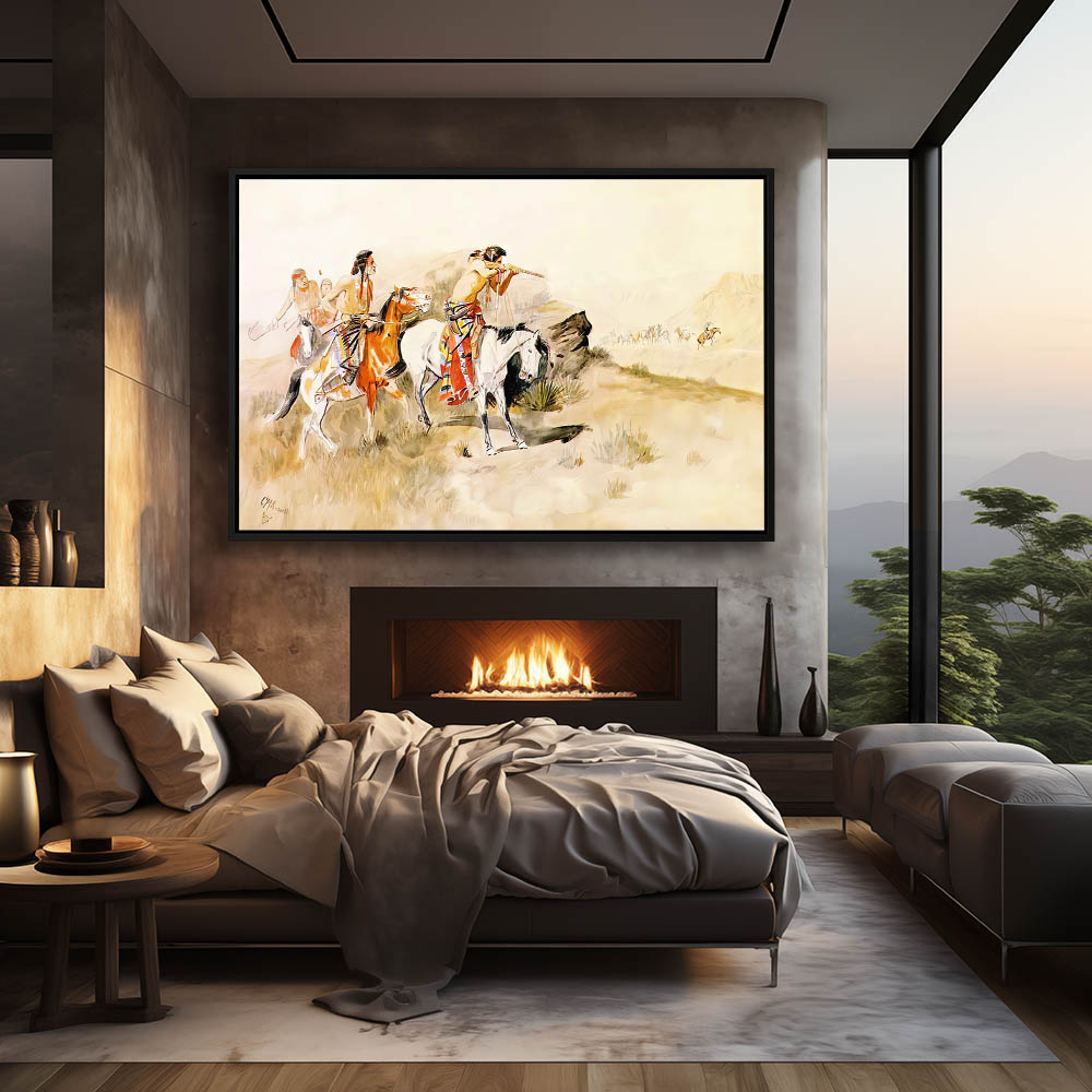 Indians on horseback shooting at riders in the distance