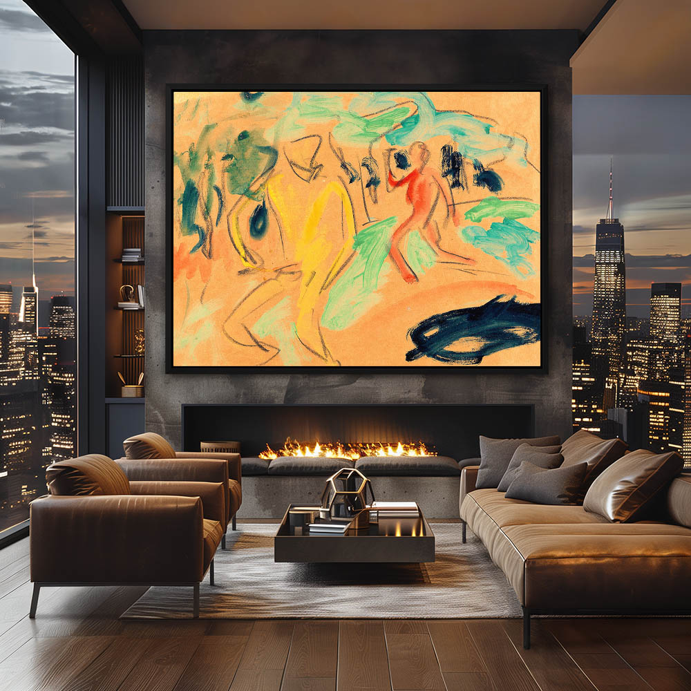 Nude female bathers at the edge of the water