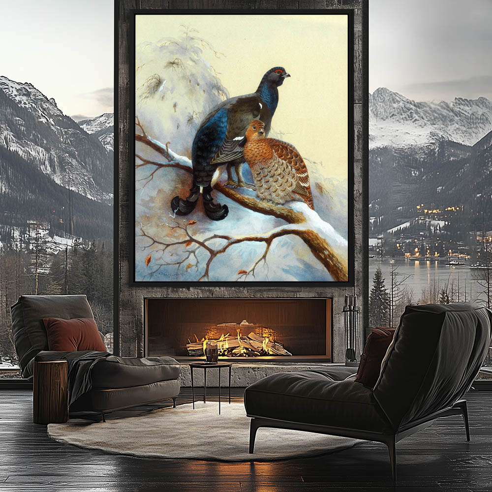 Painting of Black Grouse Gamebirds on a Limb in the Snow