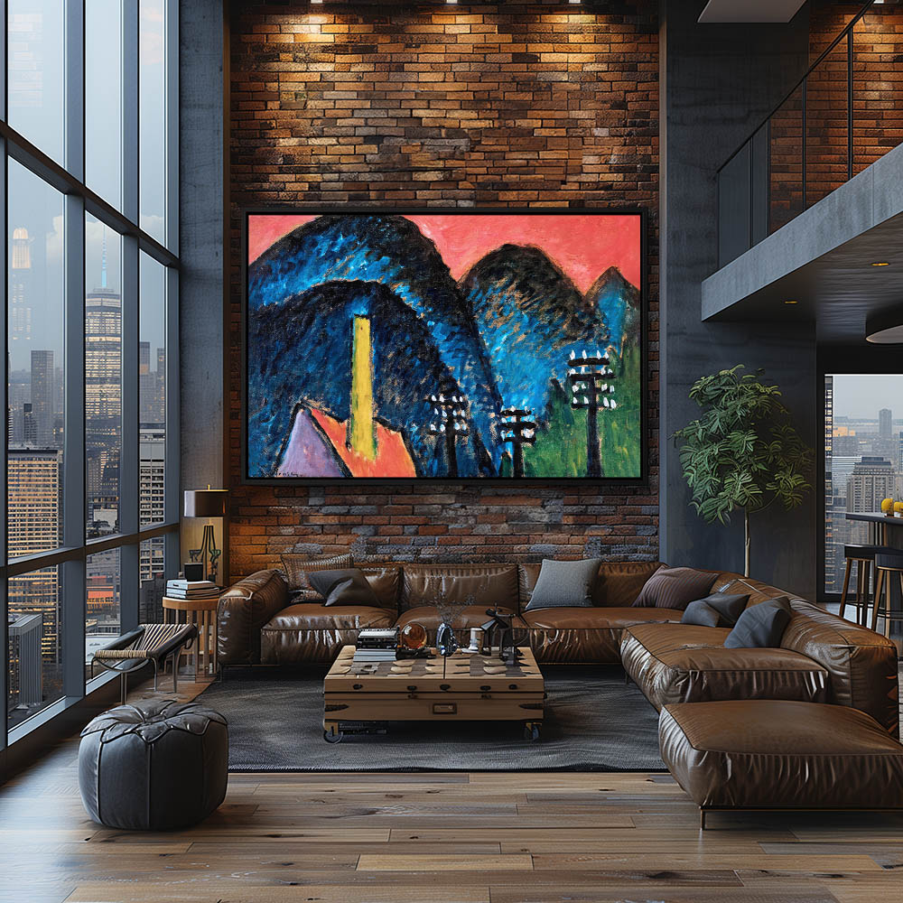 Abstract Landscape Painting With Blue Mountains and a House with a Yellow Chimney