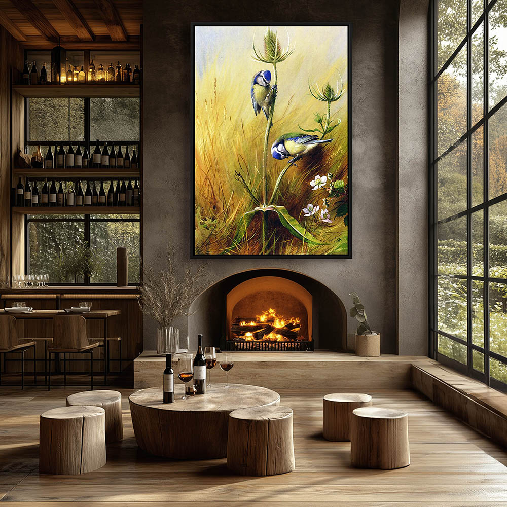 Painting of Blue Tits on a Teasel Stalk