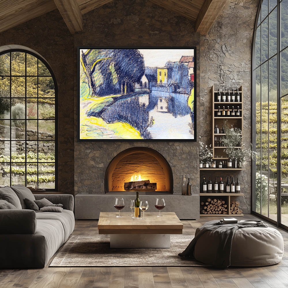 Abstract Landscape Drawing with Pond and Houses
