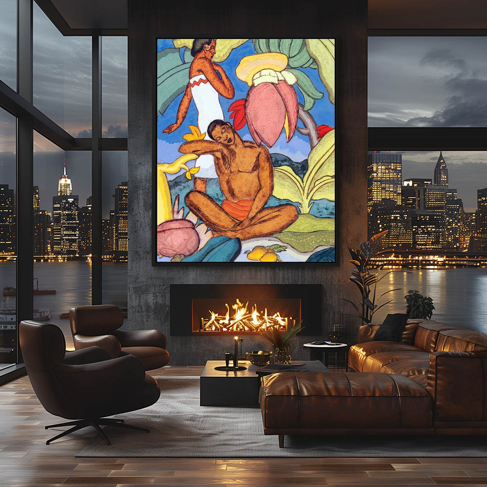 Man and woman in a Hawaiian landscape with fruit and trees