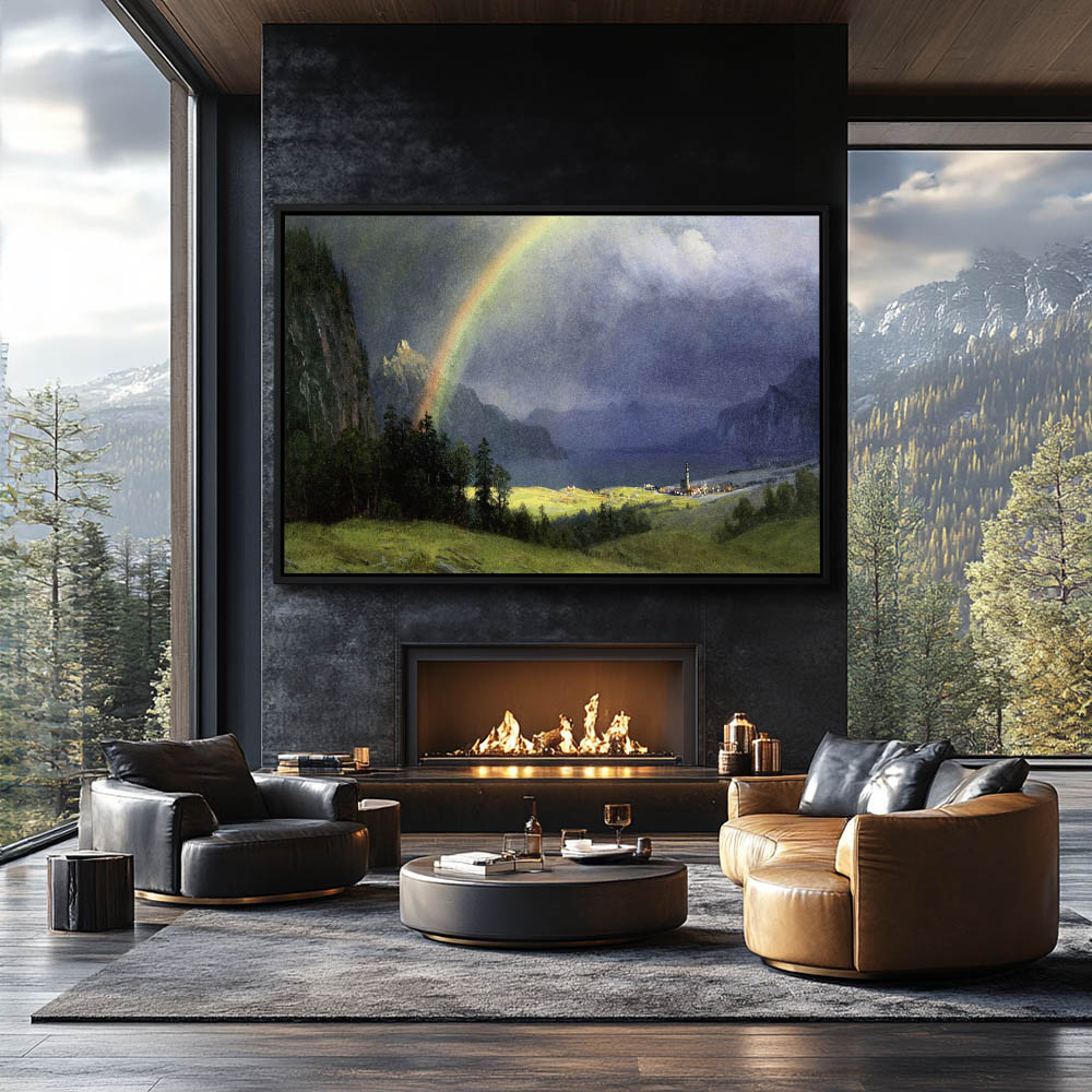 Rainbow arching over a vallley in the first rays of sun after a storm